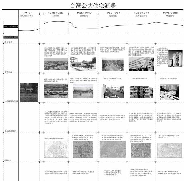 回顧過去100年來台灣公宅的演進史,透過閱讀每個時代下的時空背 景、政策背後推動的力量、以及各個時代的價值判斷及選擇,了解每個時期的 居住觀念,以及不同時代遇到的居住問題,政府透過甚麼樣的都市計劃來大範 圍的解決需求問題,以及建築師使用甚麼手法來讓居住的觀念落實到住戶身 上,一環接一環的脈絡促使了每個時期居住空間改變的契機。