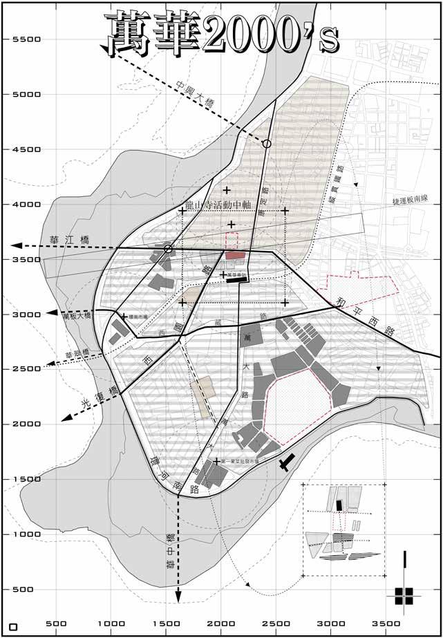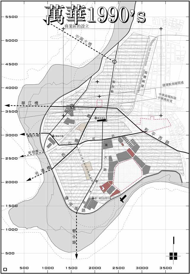1990年代的都市計畫圖中將南北萬華的使用分區明顯的區分開來,南 萬華被定調成為住宅區。捷運板南線透過龍山寺,為周遭商業帶來了人潮。