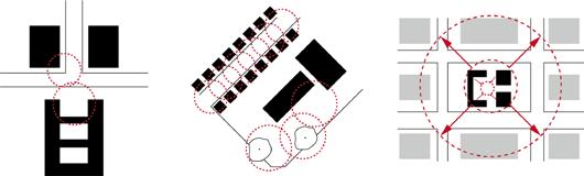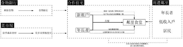 在住宅單元之中,穿插了角落廚房,讓住宅中的居民有能夠在共食餐 廳外與鄰里好友一起聚餐的空間,界定出不同層次的鄰里關係。