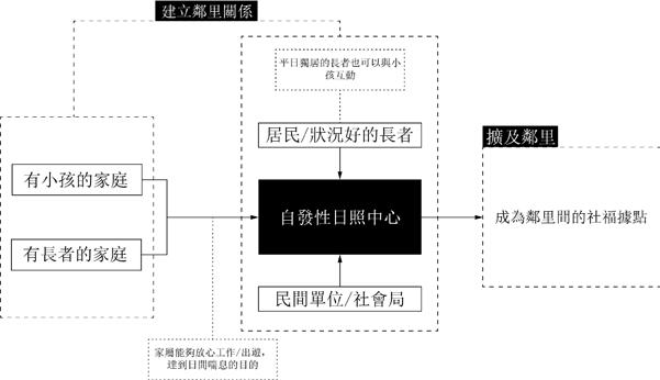 我們站在少子化與高齡化的時代浪頭上,未來拼接家庭有新的契機能 夠成為血緣家庭以外的集居模式,作為當前社會的居住實驗,共融作為城市及 住宅的基本價值,除了在意住宅的數量與可負擔性外,更該著重在新型態的都 市集居能否成為不只是另類的居住選擇,而是反映了都市人口組成的本質,以 及兼顧獨立自主與多樣性的住宅文化。身心障礙者能夠與普通住戶一起完成社 區之中的大小事,共同決定社區的決策;年長者可以在社區活動中感受到參與 感。老有所終,壯有所用的居住環境,有錢出錢,有力出力,共同會相同的生 活願景有所付出,共同享受努力換來生活品質的碩果。