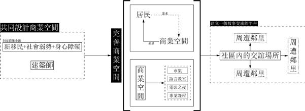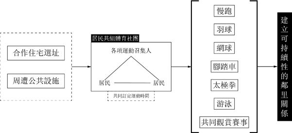 而我認為居住空間中的鄰里關係也從未消失,過去的居住實驗奠定了 台灣都市集居的雛形,而下一個階段的居住實驗應當回首凝視過去的未竟之 夢。我認為現況隱性的鄰里關係不過是缺乏了某種使人與人能夠碰面的機制, 社區內外的鄰里關係應該透過種種機制去確立,一個個有意識串聯社區內外關 係的機制就像是賦予了居住場所一層層儀式感,這些具有儀式感的互動模式由 一群共同信念與生活習慣的人一起完成,社區內外的凝聚力就會出現,同時可 被識別的鄰里關係也就此應運而生。