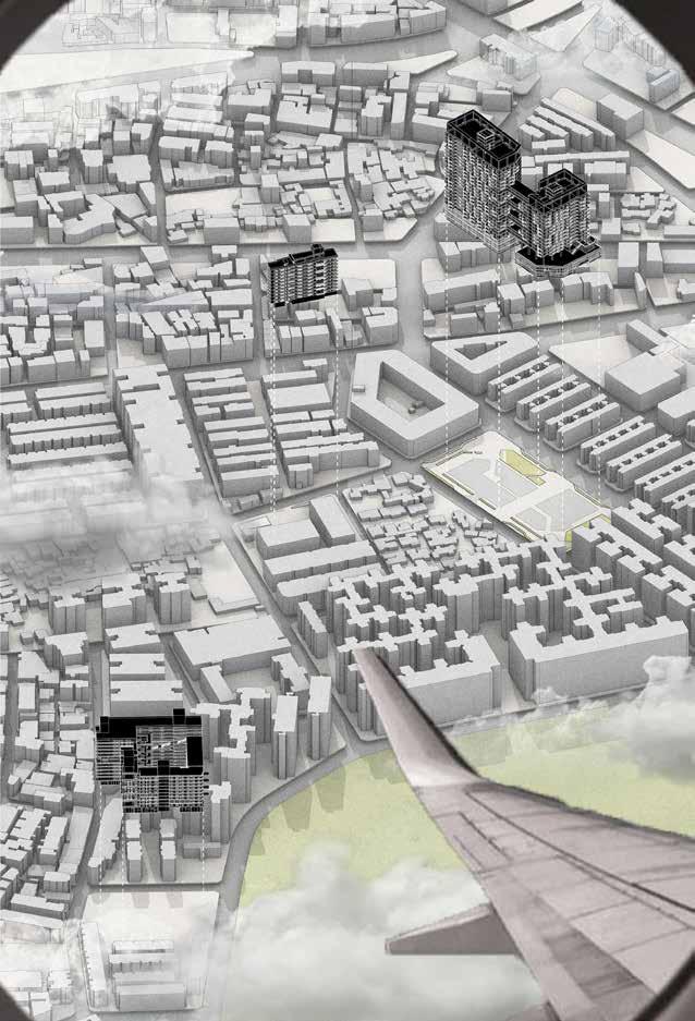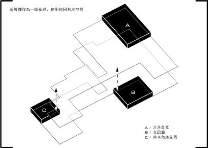 在大型的尺度內,進一步將"社群"與"社區"兩個概念細分,以兩 層樓為一個單位的社群擁有相同的共享廚房、花園、交誼廳,而整個社區共享 的空間分布在各個樓層之中,透過一條串連動線將其連結起來,建立起在都市 中垂直化簇群的集體居住。