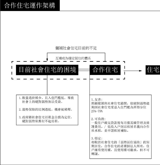 透過了解國外行之有年的合作住宅之機制,與背後提供持續運作的能 量,我想基於合作住宅的概念,提出我對台灣居住空間現況的改想,面對高房 價、少子化及高齡化,拼接家庭或許會是日後重要的家庭組成選項之一,因此 我提出一系列合作住宅的概念如何在台灣落實的機制與架構。