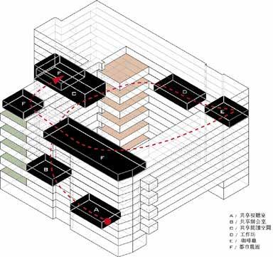 交誼廳設立在垂直動線上,並且有住戶能夠選擇的綠化方式,讓住戶 能夠在回家與出門的路上有個能夠接近花園的機會,製造出日常生活中的儀式 感。交誼廳也與角落廚房透過一條跨越三層樓的樓梯串聯起來,讓兩個聚集人 群的空間相互激發出新的連結。