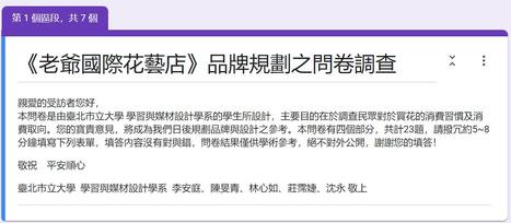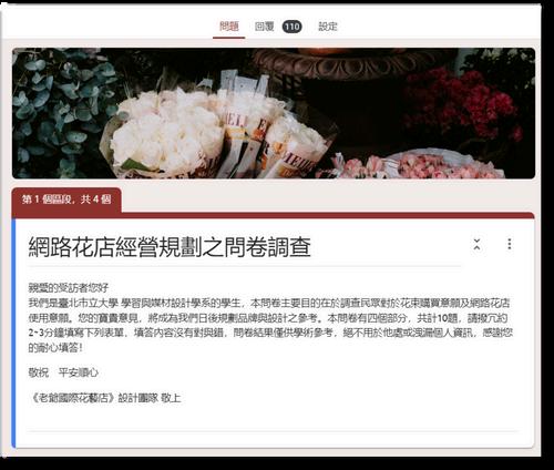 1.下列哪些形容詞符合你對於花店的想像? 結果:⼤多數⼈認為「⽂藝」較符合對於花店的想像。