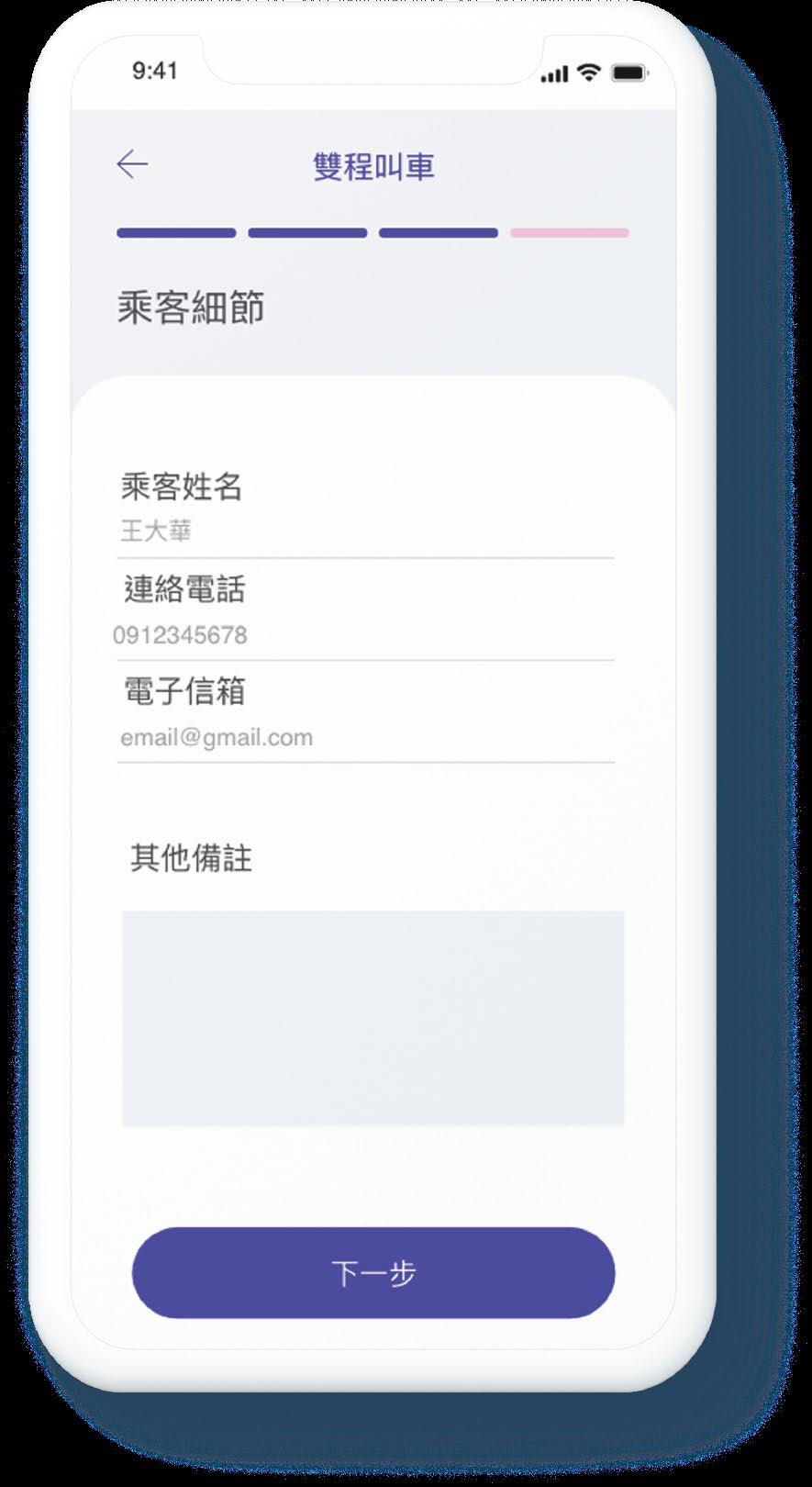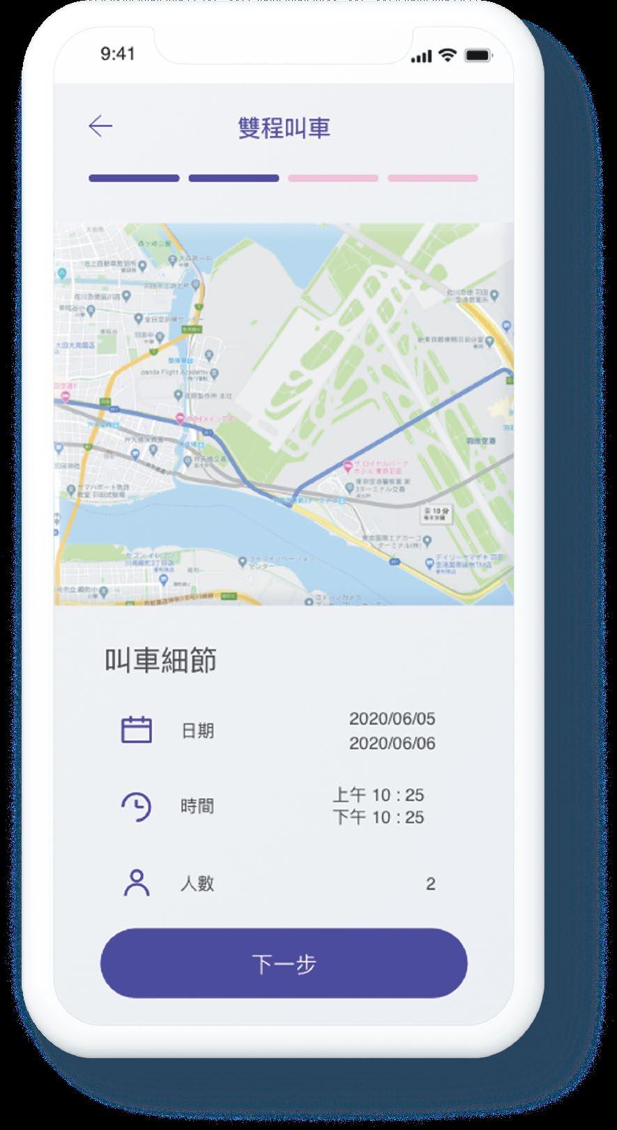雙程叫車 日本〒144-0034 東京都大田区 西糀谷3丁目37 18 大鳥居車站 9:41 確認所有細節 行駛時間 行駛距離 車型 人數 雙程 下訂單 單程 起點 終點 672 叫車 羽田機場第一大樓 大鳥居車站 2 12.5公里 12分鐘 9:41 乘客細節 乘客姓名 王大華 0912345678 email@gmail.com 電子信箱 其他備註 連絡電話 下一步 雙程叫車