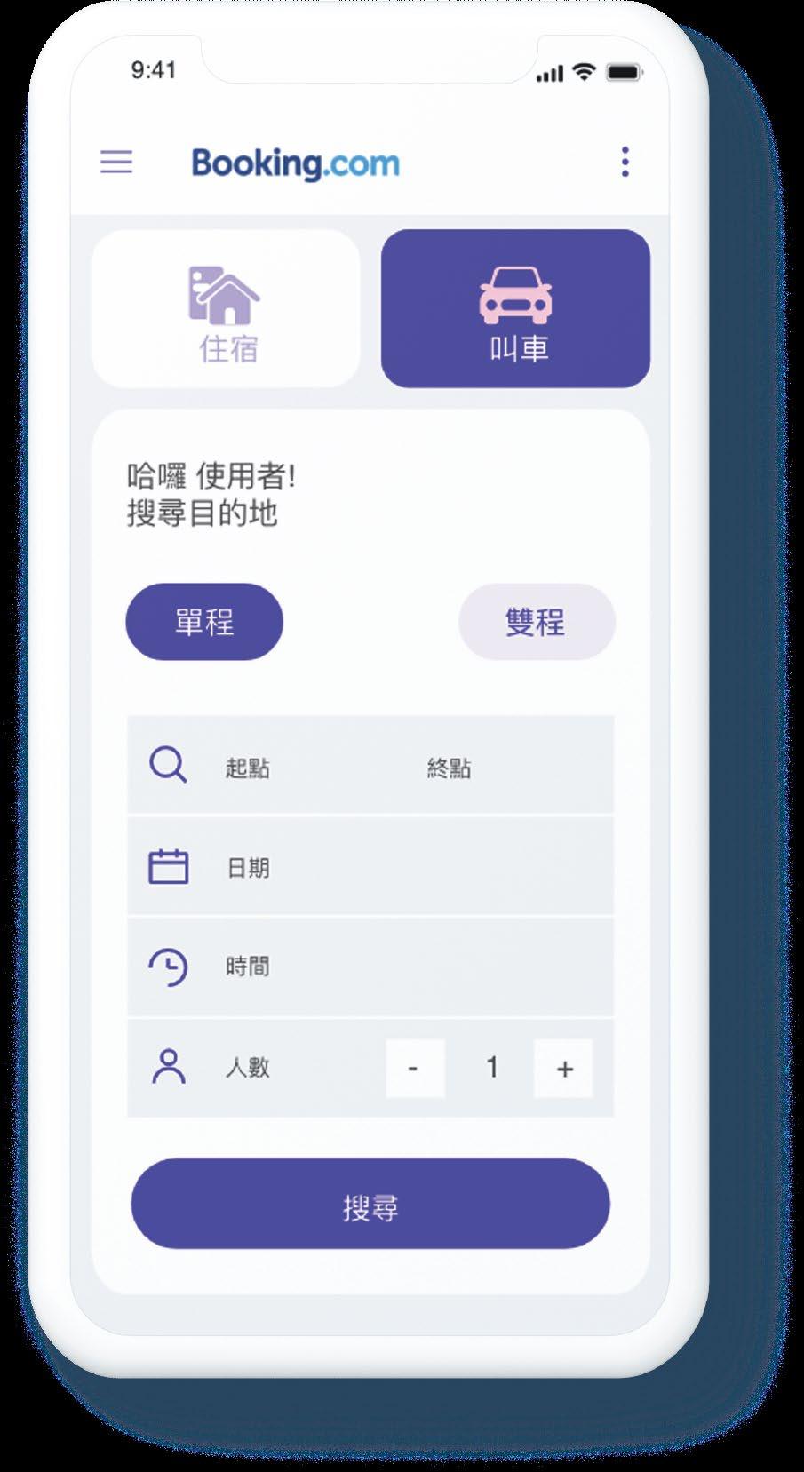 輸入訂車資訊 增加進度條,讓使用 者清楚掌握進度 住宿 叫車 哈囉 使用者! 搜尋目的地 搜尋 起點 日期 時間 人數 終點 雙程 單程 1 +叫車優化