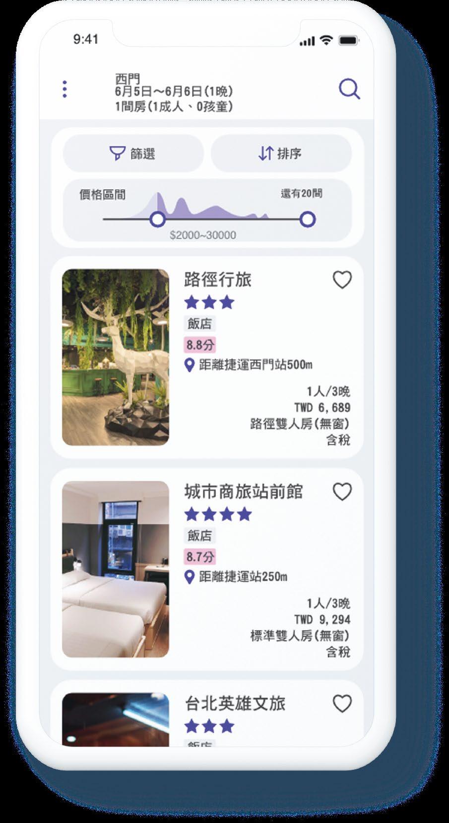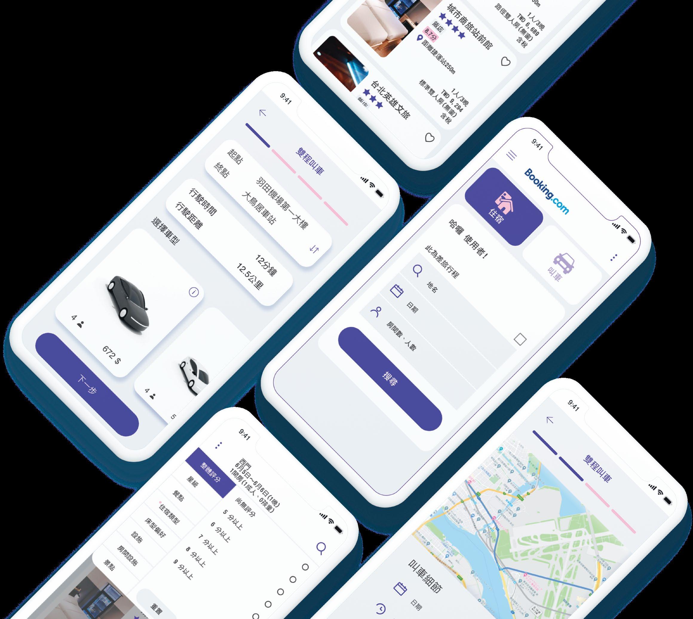旅遊是一直是許多人熱愛的休閒活動,而隨著手機應用的 發展,越來越多人會選擇使用app訂房及叫車。希望透過清 晰的介面篩選自己想要的房型及車種,並保持預訂進度的 透明度,減少每個過程中產生的不安感;也比較不會因為廣 告及其他因素影響,需要反覆切換於電腦及手機中。如此 不但能順利規劃一段符合自己需求的旅程,在行程中也能 放心享受旅程。