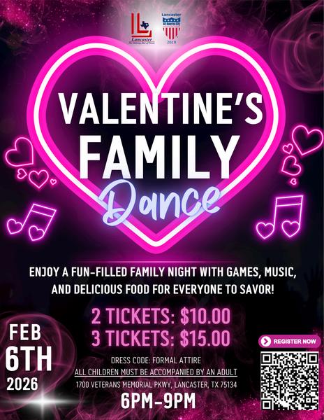 Join us for the City of Lancaster Valentines Family Dance on Friday, February 6, 2026, from 6:00 PM to 9:00 PM at 1700 Veterans Memorial Pkwy, Lancaster TX.