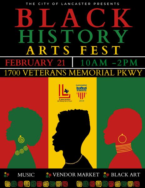 Join the City of Lancaster for the Black History Arts Fest on February 21, 10 AM–2 PM at 1700 Veterans Memorial Pkwy. Enjoy music, a vendor market, and inspiring Black art for the whole community!