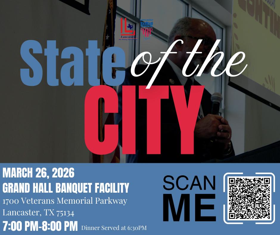 Join us for the State of the City as we reflect on Lancaster’s progress, celebrate achievements, and look ahead to the future of our community This special event will take place on March 26, 2026, from 7:00 PM – 8:00 PM at the Grand Hall Banquet Facility, 1700 Veterans Memorial Parkway, Lancaster, TX.