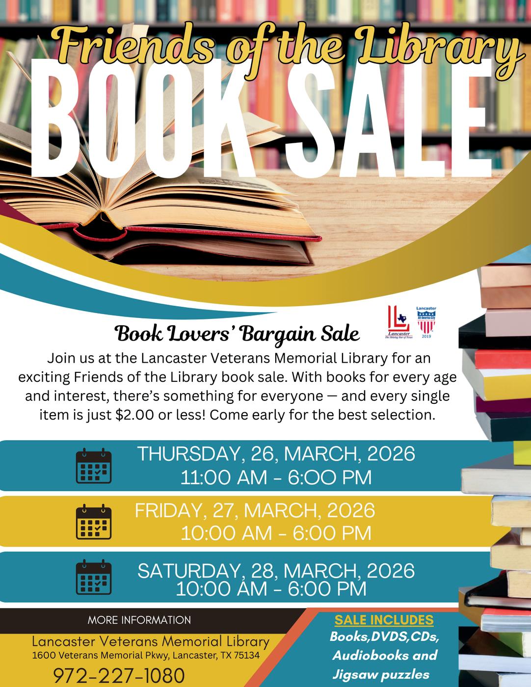 The Friends of the Library Book Sale at the Lancaster Veterans Memorial Library invites book lovers of all ages to browse a wide selection of affordable reading materials and media. This Book Lovers’ Bargain Sale features books for every age and interest, with every item priced at $2.00 or less, making it a great opportunity to stock up on great reads at a low cost. The sale will take place over three days: Thursday, March 26, 2026 (11:00 AM – 6:00 PM), Friday, March 27, 2026 (10:00 AM – 6:00 PM), and Saturday, March 28, 2026 (10:00 AM – 6:00 PM). In addition to books, shoppers can find DVDs, CDs, audiobooks, and jigsaw puzzles