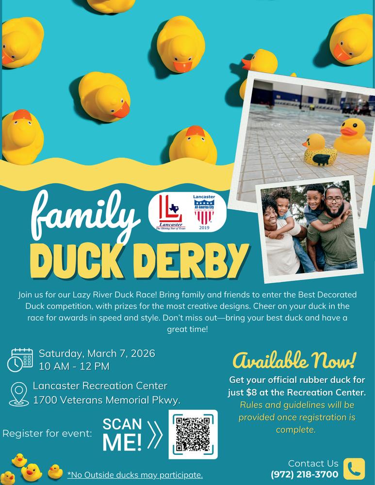 Join us for a fun-filled morning at the Family Duck Derby! Bring your family and friends out to the Lazy River Duck Race and cheer on your duck as it races to the finish. Participants can also take part in the Best Decorated Duck Competition, where the most creative designs will win exciting prizes. The event takes place Saturday, March 7, 2026, from 10:00 AM to 12:00 PM at the Lancaster Recreation Center (1700 Veterans Memorial Pkwy.).