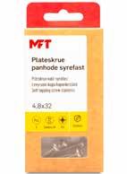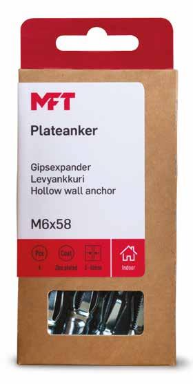 MFT SMÅPAKK KATALOG 2023/2024 5 INNHOLD: Betongskrue 68 Betongskrue for karmhylse 64 Bladskrue .................................................................................. 20 Billedhempe ............................................................................. 81 Billedkrok m/stift 81 Billedkrok mini ........................................................................ 80 Billedkrok medium/maxi ..................................................... 80 Dørdemper 82 Dykkertspiker 71 Ekspansjonsbolt ..................................................................... 66 Ekspresspiker 57 Fasadeplugg inkl skrue 46 Fasadeplugg kombi m/skrue ............................................. 44 Firkantskive 39 Firkantspiker 70 Fransk treskrue ....................................................................... 13 Gipsfeste m/skrue 55 Gipsfeste mini m/skrue 55 Gipsfix ......................................................................................... 51 Gipskrok 79 Horisontalskrue 65 Justerskrue .............................................................................. 60 Karmanker fast 61 Karmanker fast m/propp 61 Karmhylse................................................................................. 62 Karosseriskive 38 Korrosjonsklasser 6 Krok ............................................................................................. 78 Lettbetongplugg 48 Lettfix 56 Liste-/platestift ....................................................................... 72 Listeskrue ................................................................................. 15 Låsemutter 27 Låsemutter m/nylonring ..................................................... 33 Låseskrue el.sink m/mutter ............................................... 25 Låseskrue varmforsinket m/mutter 26 Maskinskrue A4 linsehode 30 Maskinskrue A4 sylinderhode ........................................... 29 Maskinskrue el.sink sylinderhode 28 Maskinskrue for plateanker 53 Messingstift .............................................................................. 73 Murstift 58 Monteringsskrue 17 Møbelfilt firkantet .................................................................. 85 Møbelfilt m/hylsefeste 86 Møbelfilt m/stift 86 Møbelfilt rund .......................................................................... 84 Møbelglider 86 Møbelstift .................................................................................. 74 Nettingkrampe 74 Nylonplugg 40 Nylonplugg m/skrue ............................................................. 42 Nøkkelmerke 87 Opphengsbånd 60 Opphengsbånd plastbelagt ................................................ 59 Pappspiker 72 Plastplugg 50 Plastpropper ............................................................................ 62 Plateanker 51 Plateanker vinkel/krok 52 Platefeste.................................................................................. 36 Plateskrue-farmerskrue 16 Plateskrue panhode A4 21 Plateskrue linsehode A4 ..................................................... 20 Rennekrokskrue 19 Ringmutter 35 Runddykkert ............................................................................. 71 Sekskantmutter ...................................................................... 32 Sekskantskrue m/mutter 22 Skive rund ................................................................................. 36 Skive rund stor ........................................................................ 37 Skjøtemutter 34 Skruekrok el.sink 76 Skruekrok hvitlakkert ........................................................... 76 Speilbeslag 87 Spikerplugg 43 Spiralkrok + øyekrok ............................................................. 75 Stift tacks 73 T-plugg 50 Takanker m/krok og skive ................................................... 47 Treskrue el.sink panhode 9 Treskrue el.sink senkhode 7 Treskrue for karmhylse ....................................................... 63 Treskrue ruspert 12 Treskrue VVS 10 Treskrue XLNT .........................................................................11 Universalplugg m/krave 49 Universalplugg m/krave og skrue 49 Vindublikkskrue....................................................................... 19 Vingemutter 35 Vinkelskrue 77 X-krok ......................................................................................... 78 X-krok m/stift 79 X-krokstift 78 Øyeskrue.................................................................................... 75 Øyeskrue m/sveiset øye ...................................................... 58