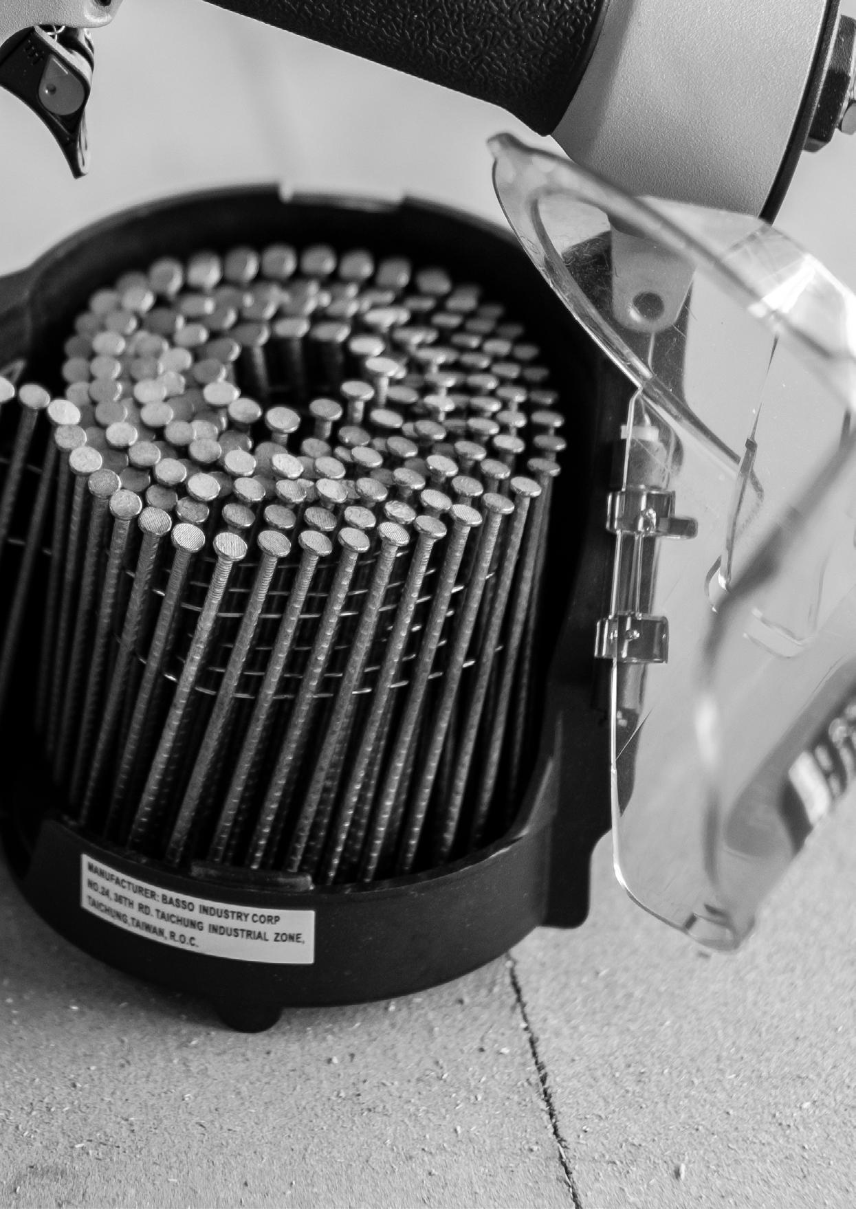 Kompressor, spiker, skruer og festemidler.