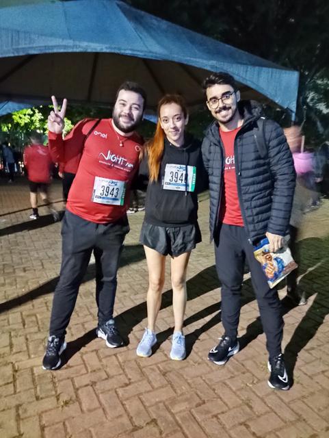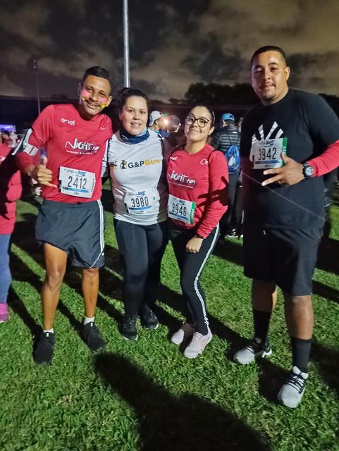 "05/11 Eu estava saindo de uma super gripe, mas a animação do grupo no WhatsApp era contagiante e eu não me permiti ficar fora desse evento. Meu marido decidiu me acompanhar e chegamos em torno das 18h30 na USP, onde seria o evento. Minha primeira impressão foi de muita organização. Tudo muito bem sinalizado até a chegada no local de concentração Havia um show muito bom acontecendo, pessoas aquecendo, o clima era animador! O organizador da G&P, o nosso Naka como sempre solícito recepcionando a todos, agregando, orientando e, claro, tirando fotos nossas Na sequência, após o aquecimento coletivo, fomos à pista de corrida, era muita gente! Como disse, foi a minha primeira vez, então achei tudo muito grande e super organizado A Corrida foi ótima, nos davam total assistência durante todo o Circuito e haviam ambulâncias no
