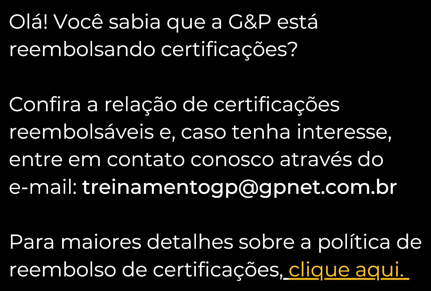 Confira a relação de certificações reembolsáveis e caso tenha interesse, entre em contato conosco através do e-mail: treinamentogp@gpnet.com.br