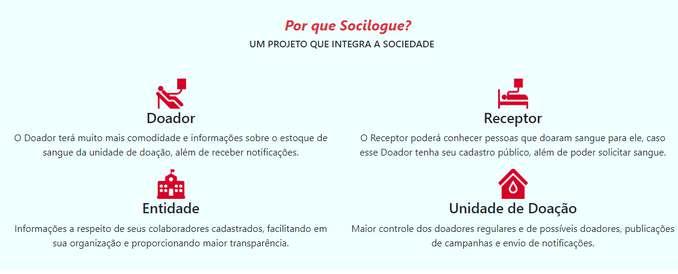 Francisco: O Socilogue (Sociedade pelo Sangue) é uma plataforma web, desenvolvida como projeto de conclusão de curso, que visa o aumento, a manutenção e o registro de doações de sangue Aonde é possível ter 4 tipos de usuários (o serviço de hemoterapia, o doador de sangue, o receptor de sangue e empresas)