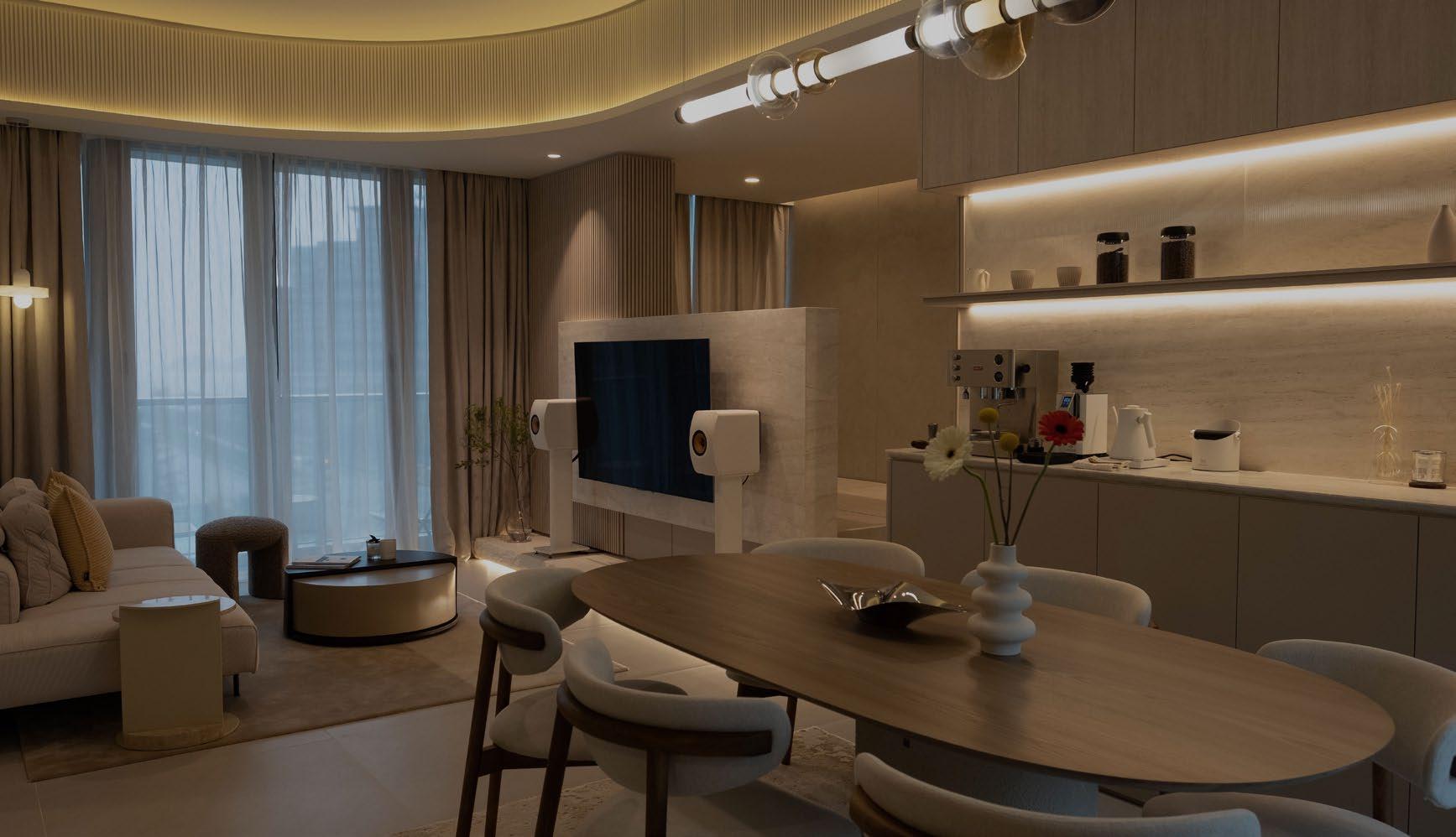 The design of the space interlock with different geometry with a free transitional between living sapace and dinning space.