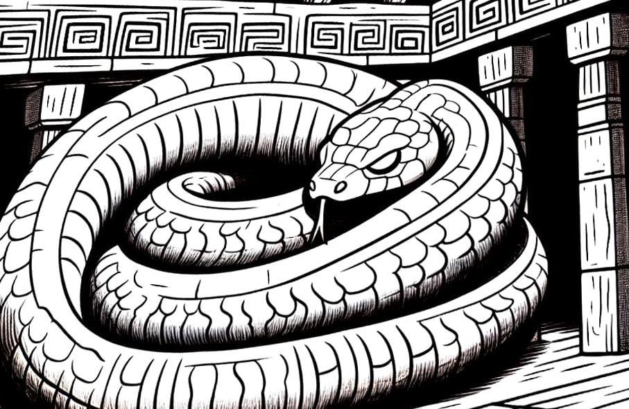 After climbing the temple stairs, when they finally reached the entrance, they immediately saw a handwritten note: “To reach the treasure, face the guardian serpent.” As soon as they walked in, deeper into the temple, they saw a gigantic serpent sleeping and the treasure behind it.