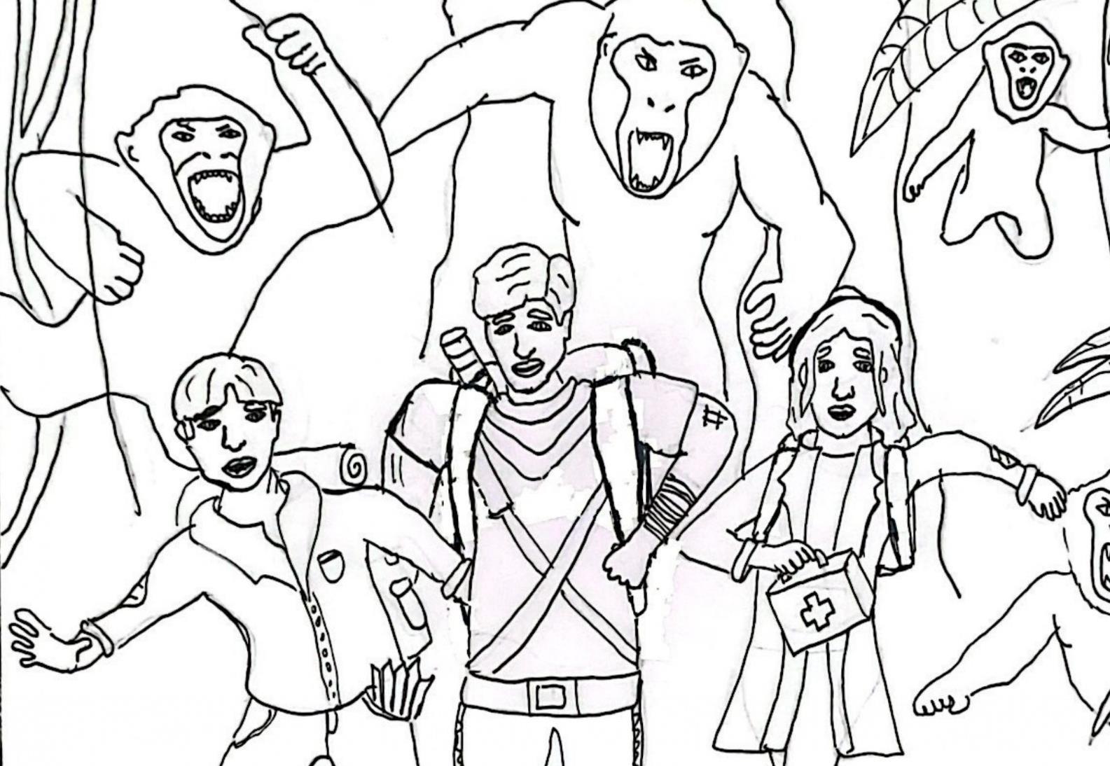As they continued on their way, they come across many banana peels on the ground. Suddenly, they started hearing monkeys all around them and, when they looked up, they found dozens of creepy enraged monkeys sitting on the top of the trees staring down at them. Frightened, the friends ran through the jungle and the monkeys started to chase them.