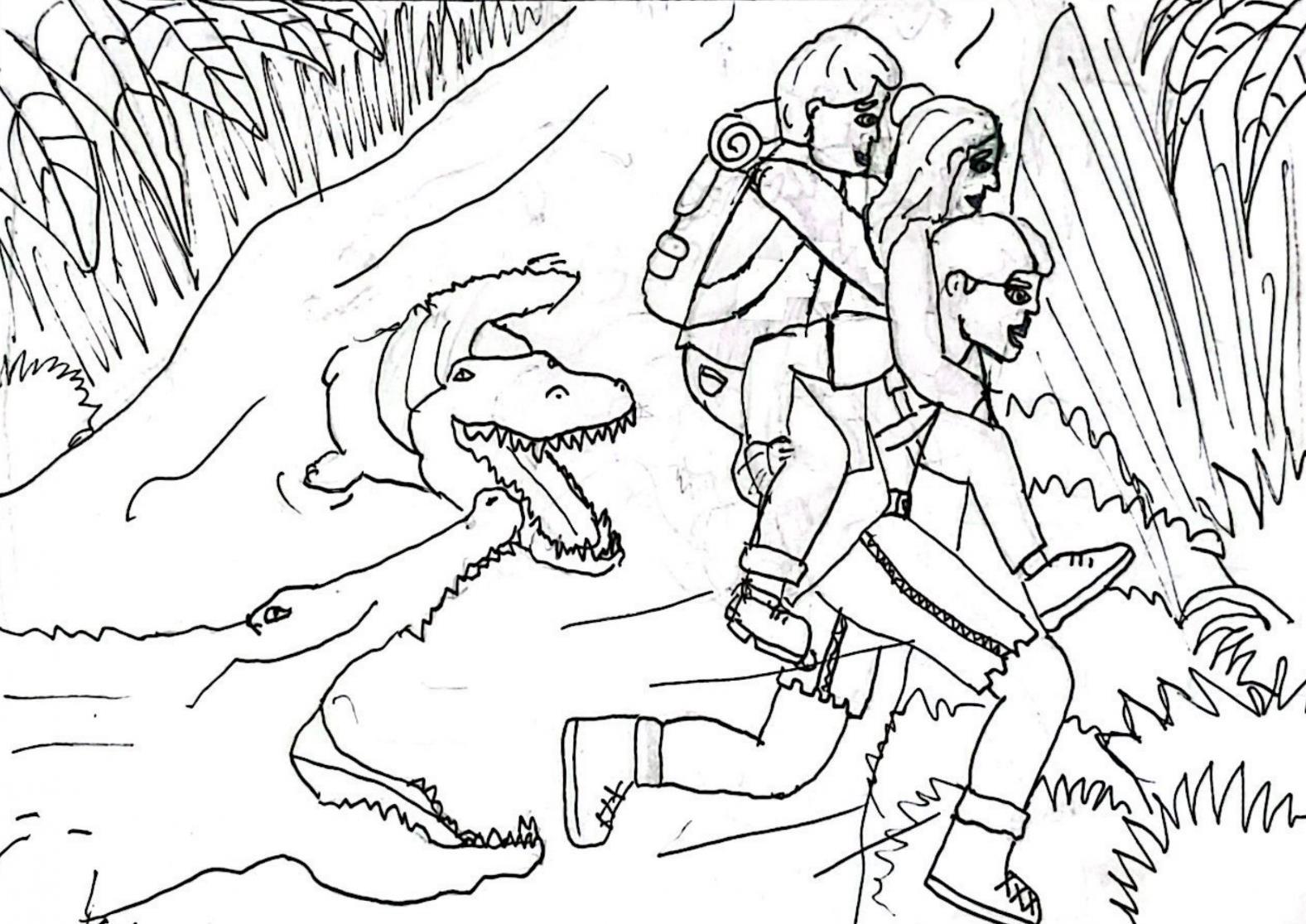 After a while, following the route presented on the map, they manage to arrive at a river full of crocodiles. The group thought about looking for another path, but the clock was ticking, and they had to rush, so they decided to cross the river. While they were thinking about how they would do it, the mysterious man appeared again, saying that the warrior, Max, received three superpowers to help them with their adventure, which was super strength, high speed, and mega jump. So, Max grabbed his friends and jumped over the river with the hungry crocodiles