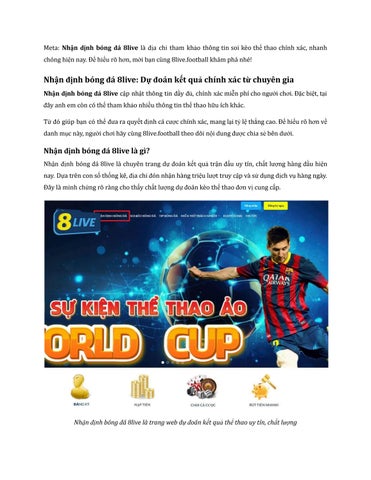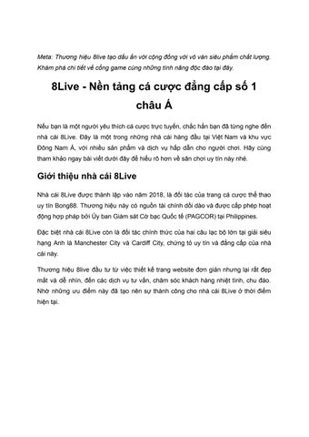 Thương hiệu 8Live là một điểm đến quen thuộc của đông đảo cược thủ quốc tế và Việt Nam. Nền tảng thành công chinh phục mọi thành viên nhờ vào nhiều lợi thế nổi bật, trở thành lựa chọn hàng đầu cho tất cả mọi người. Tham gia ngay để không bỏ lỡ bất kì trận đấu bóng đá nào tại: https://8live.football/