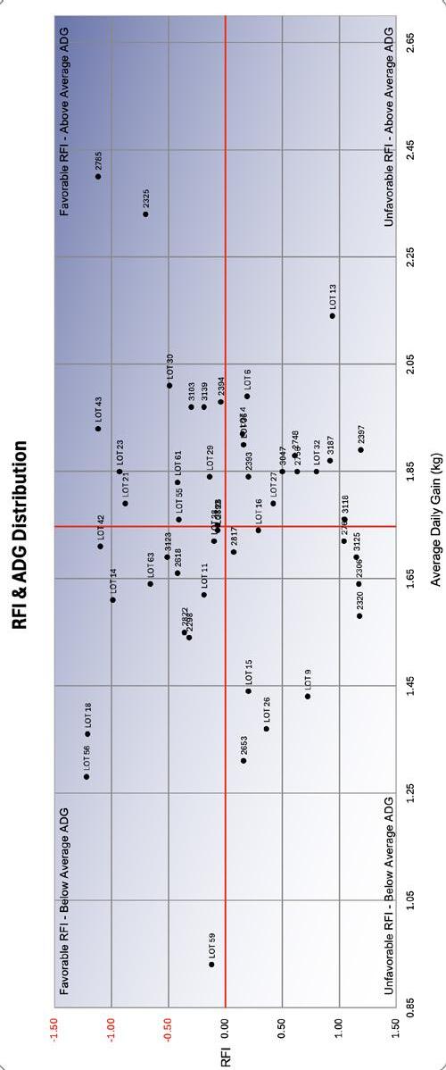 RFI: residual feed intake, RFI, is a measure of feed efficiency calculated as the difference between the animal’s actual feed intake and its predicted feed intake, for a given level of production. When RFI is used as a genetic selection tool, the resulting progeny will consume less feed for the same level of production. RFI is independent of growth, body size and other performance traits (Koch et al., 1963), selection for animals with low RFI will lead to reduced feed intake and improved feed efficiency without compromising body size, carcass quality or growth. Lower RFI values are more favorable, cattle with low RFI values are more efficient than cattle with high RFI values.
