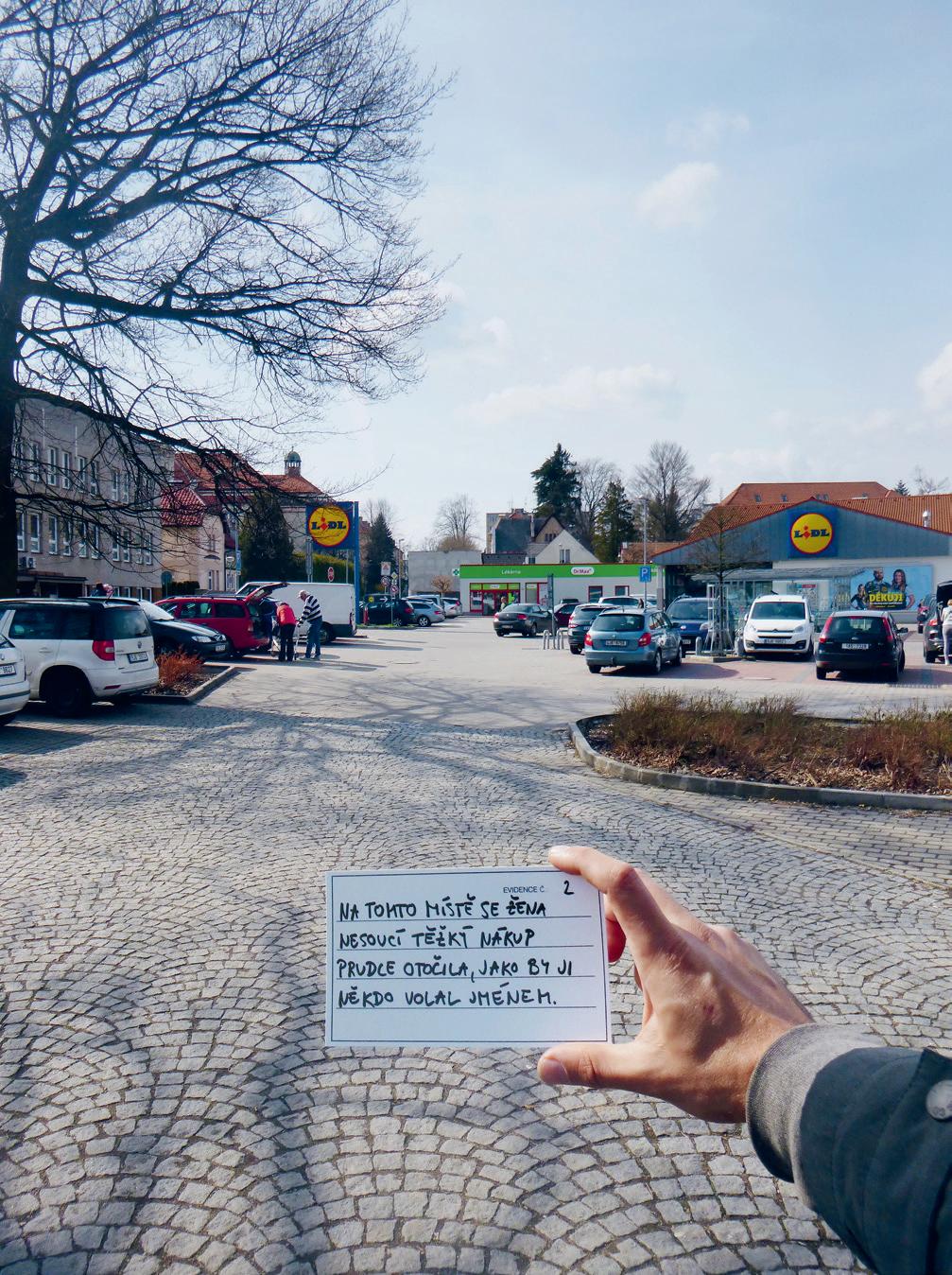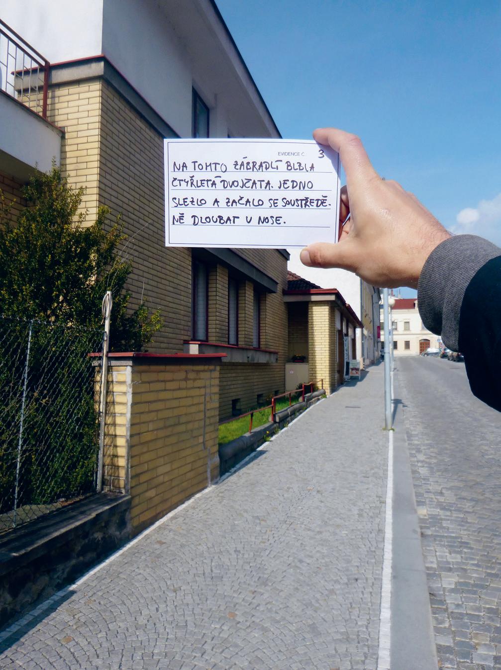 Obešel jsem Humpolec velmi pomalou chůzí. Všímal jsem si drobných událostí a zaznamenával je. Drobné byly jednak proto, že se žádná velká nestala, jednak proto, že jsem městem procházel s pozorností zostřenou právě k nim. Zajímala mě gesta všednodennosti a mikroudálosti, které se nacházejí na rozhraní privátního i kolektivního, subjektivního i veřejného. Privátního proto, že pohnutky k těmto efemérám jsou často nezapříčiněné nebo jen částečně zapříčiněné místem, kde se odehrály; a veřejného tím, že je sdílený prostor nese a přijímá – vnímáme je jako banální součást běžného cvrkotu. Pracovním nástrojem pro mě byla jemně modulovaná všímavost: pokud si představíme škálu mezi úplnou ignorancí a naprostou pozorností, citlivost jsem měl nastavenou zhruba ve třech čtvrtinách. V režimu úplné nevšímavosti bych totiž neviděl nic, respektive vše by působilo jako banální a nevýznamotvorné. Naopak s maximální pozorností bych nemohl udělat ani krok, protože zmínkotvornou by se stala jakákoli změna. Potenciál události by měla samotná změna denního světla, závan větru, přelet ptáka apod. Efemérní jevy, které jsem potkal, jsem zaznamenával na evidenční kartičky. Zápis byl jakousi post-momentkou, krátkým popisem toho, co vzniklo a v okamžiku opět zaniklo. Veřejný prostor, v němž se události odehrávaly, lze v tomto světle vnímat jako krajinu malých gest.