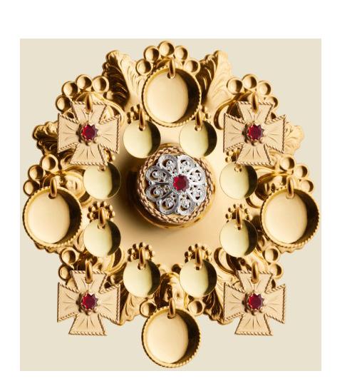 Øverst: Filigransarbeid er bygget opp av tråder og kuler. På latin betyr «fil» tråd og «gran» korn. Teknikken brukes blant annet til å lage bolesøljer fra Telemark og Setesdal, slik som de på det røde brettet.