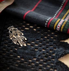 Silketørklær brukes på ulike måter til ulike bunader. I kvinnebunaden fra VestAgder knytes tørkleet foran rulten, som er hodeplagget for ugifte, og rundt skjortekragen. Silketørklær fra Tyrihans (fra kr 1400), maskinvevd hårbånd fra Møre Bånd & Vev (kr 630) og håndlagd rult (kr 4650), alt fra Norsk Flid Husfliden i Kristiansand og Mandal. norskflid.no