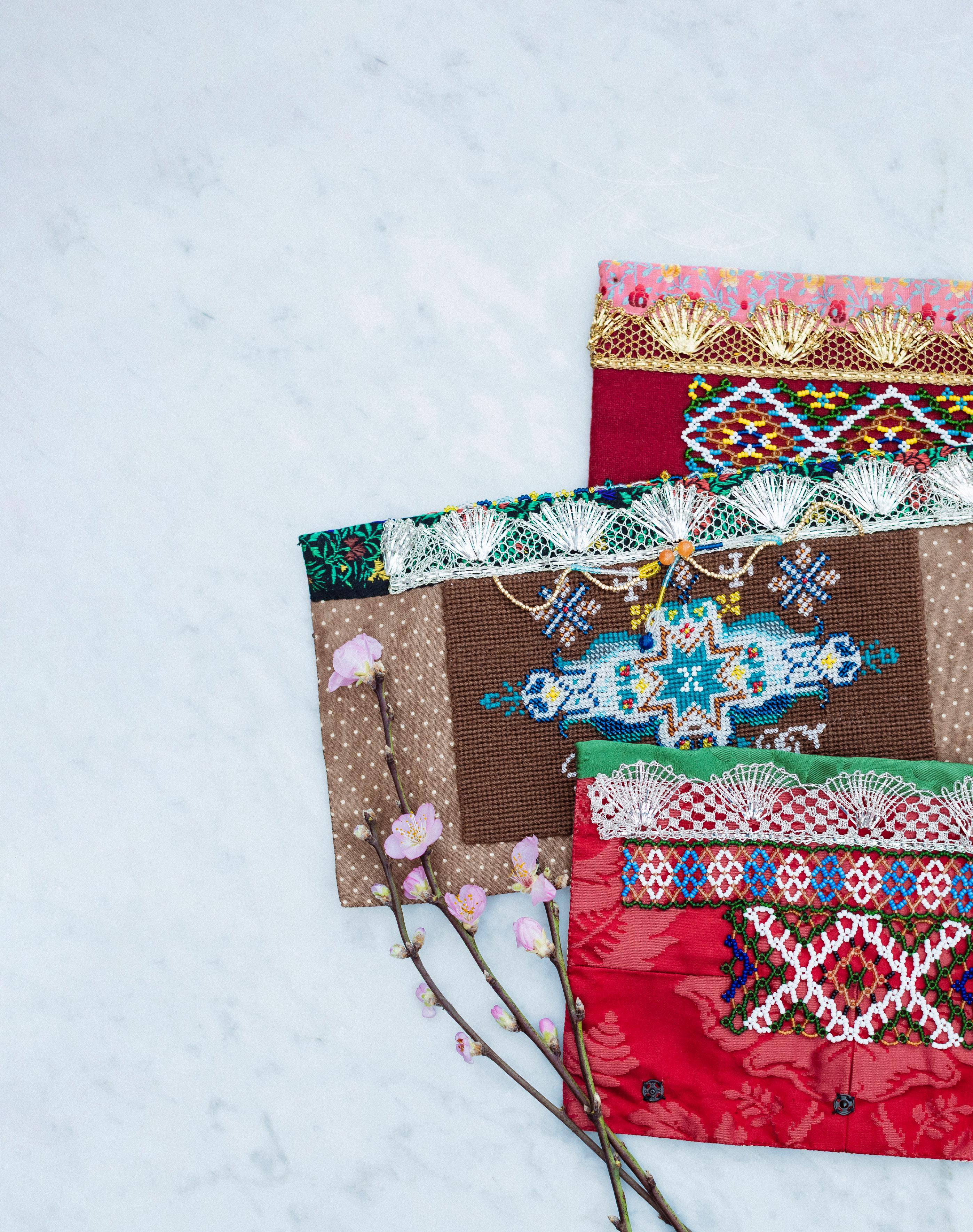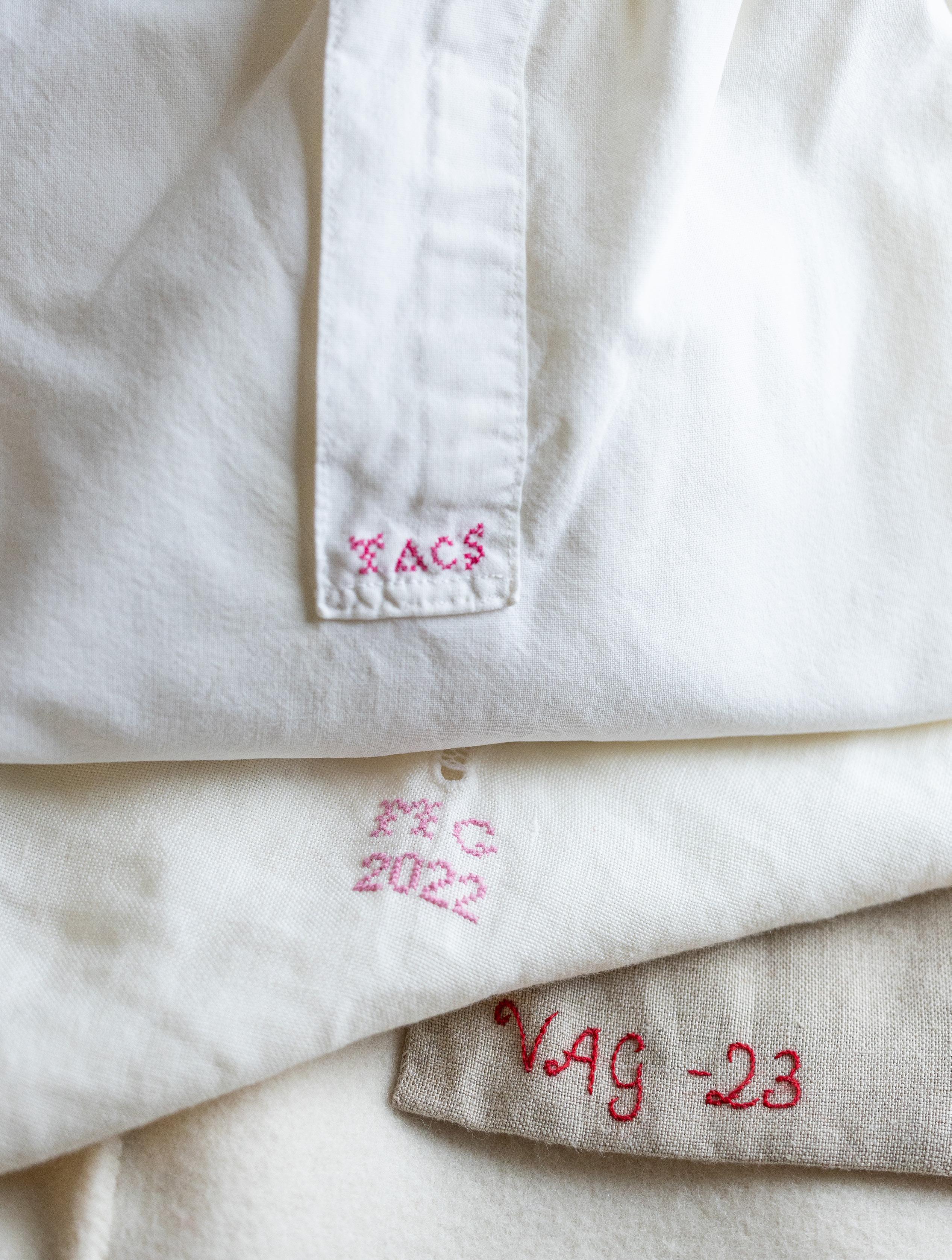 To skjorter med ulike varianter av korsstingbroderi. Nederst vises innsiden av en vest med initialer og årstall i kontursting. Bringedukene på forrige oppslag bruker Camilla til den rekonstruerte bunaden på forsiden. Den brune har initialene CG i perlebroderi.