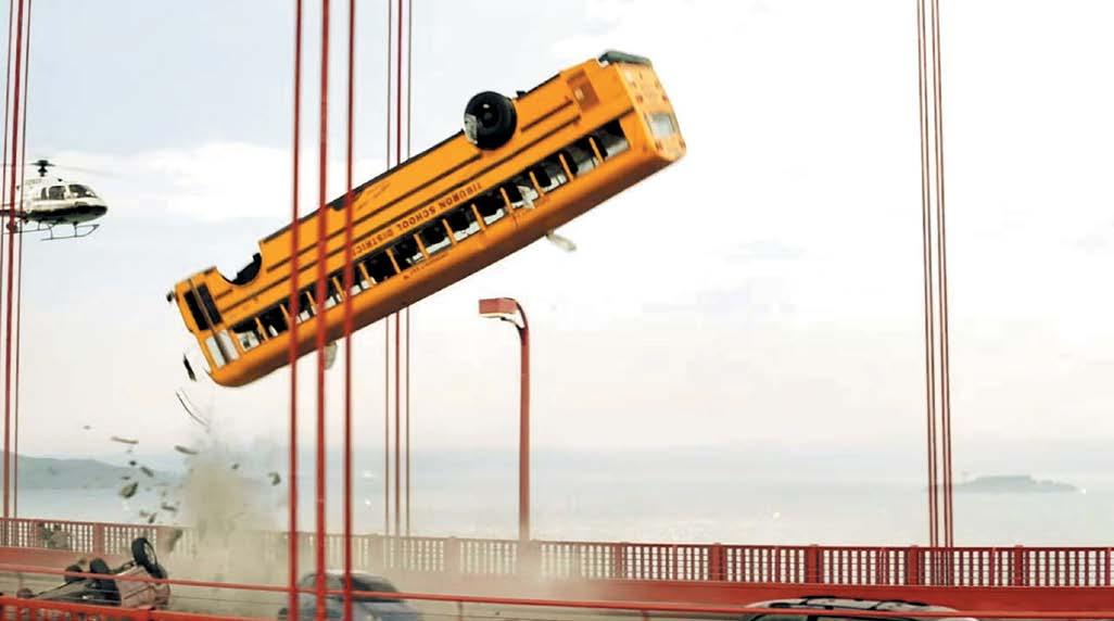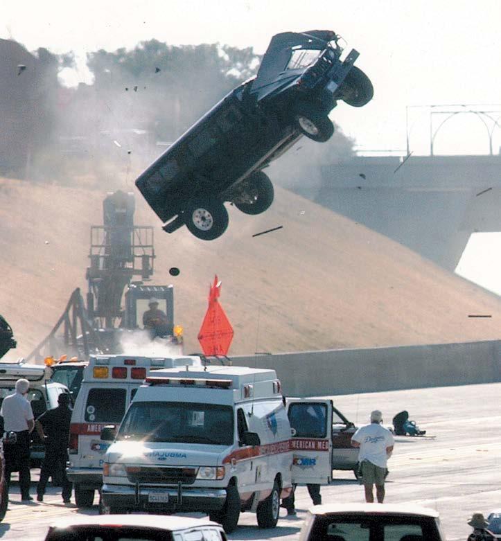 Flying vehicles are a specialty of Stunts Unlimited. Top: A Hummer H1 goes airborne in Torque. Middle: Debbie Evans doubles for Carrie Ann Moss’s Trinity character in The Matrix Reloaded. Below: A full-size school bus does a complete flip in Terminator: Genisys.