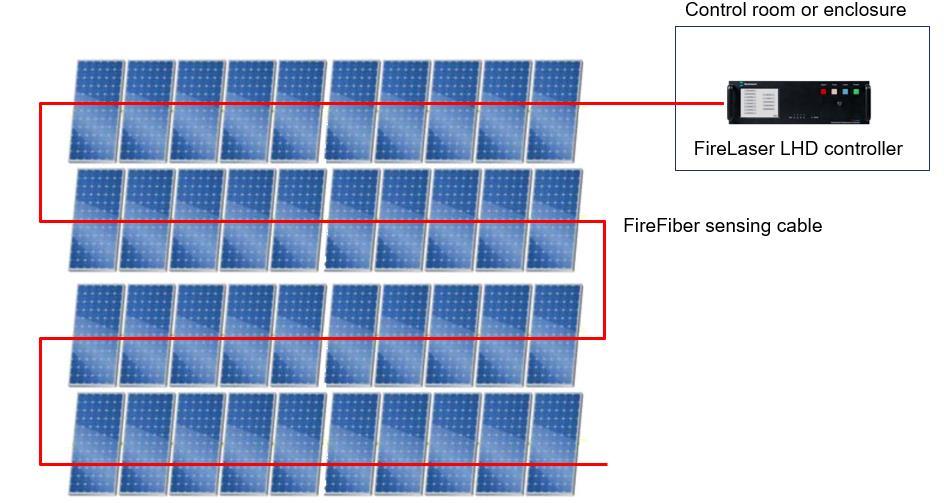 Each of the FireLaser LHD controllers can measure up to 10km on each sensing cable, with measurements every 1m. This means that a single controller can cover a large size solar power array. In this case the cable is typically run in continuous length throughout the entire array (as shown below).
