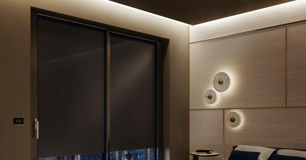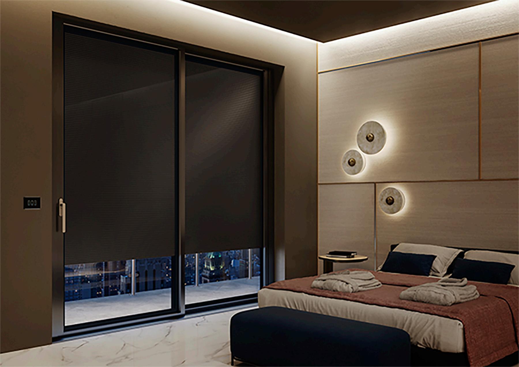 The blind is raised and lowered by an internal motor driven by wall buttons, remote control, app or BMS.