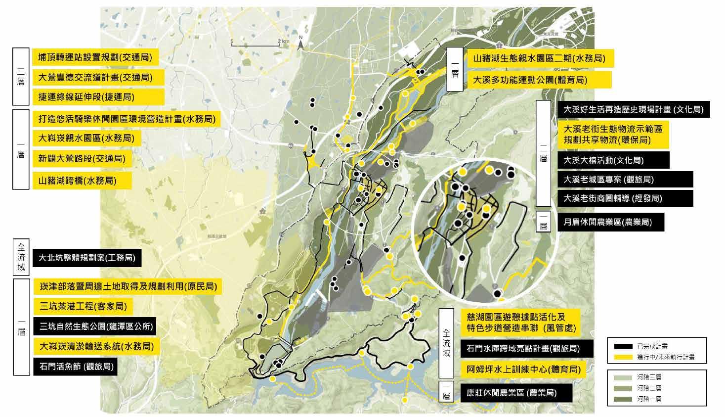 Due to lack of master planning and local consensus of the regional development, Taoyuan City Governement aims to deliver a regional identity and cohesive " brand" integrating all the exisiting local development at the reclaimed land situated in-between Daxi District and Long-Tan District. In the proposal, the brand "Takoham" was suggested based on extensive historic documents and cultural referencing. GIS and national land-use system were widely use to map out the spatial profile of all the development schemes in the region and conclude the physical relationship under the proposed regional identity. The final proposal was to create a guidebook for the lcoal government bodies about how to integrate with different departments in the future and facilitate administrative cohesion.
