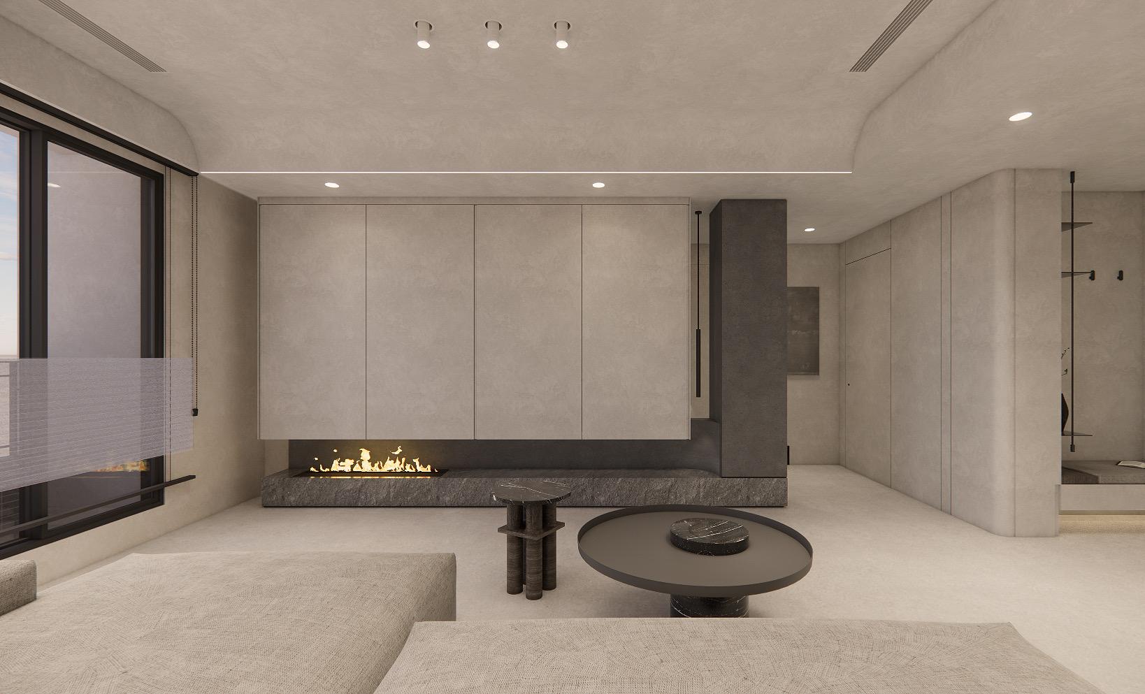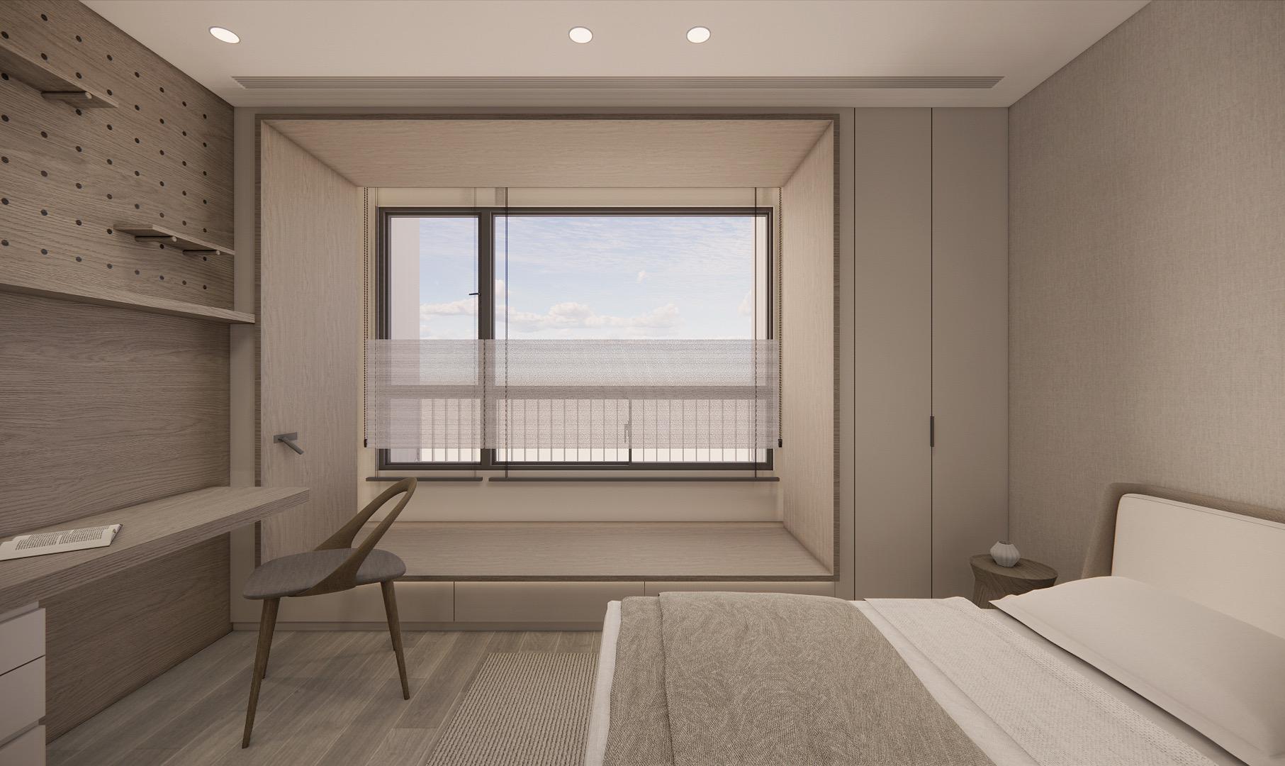 依原始主臥格局,於主床後方,規劃收納空間,後方收納櫃 體面結合繃布造型作為床頭板,低調沈穩,符合男主人喜好。