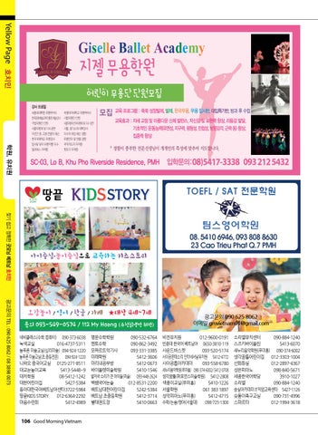 광고문의 090 625 8062 이메일 gmvietnam01@gmail.com 비전유치원 012-9600-0191 빈증대 한국어 베트남어 0650-3810-119 사운드바스켓 093-520-5174 사이공몬테소리 인터네셔날유치원 5412-4772 사이공톱아카데미 093-558-6780 새누리음악학원(푸미흥) 090-374-6002/ 5412-0708 생각꿈틀(퍼포먼스미술학원) 5412-2808 색종이교실(푸미흥) 5410-1226 서울학원 061 383 1897 성악피아노(푸미흥) 5412-4715 수학/논술/영어(서울대) 098-725-1300