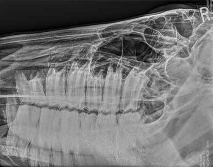 Radiographs are the most common first step in evaluating a horse’s mouth after a thorough exam from a veterinarian. Horses have a complex system of air-filled sinuses in their skull which creates good radiographic images with the contrast of bone and air.