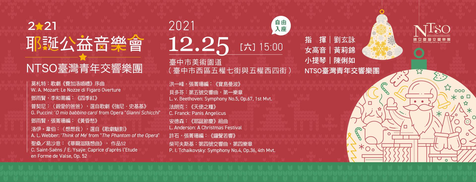 19 NTSO臺灣青年交響樂團 自由 入座 2021 12.25 15:00 六 臺中市美術園道 (臺中市西區五權七街與五權西四街) 曲目 Program 莫札特:歌劇《費加洛婚禮》序曲 W. A. Mozart: Le Nozze di Figaro Overture 鄧雨賢,李和莆編:《四季紅》 普契尼:〈親愛的爸爸〉,選自歌劇《強尼.史基基》 G. Puccini: O mio babbino caro from Opera Gianni Schicchi 鄧雨賢,張菁珊編:《黃昏愁》 洛伊‧韋伯:〈想想我〉,選自《歌劇魅影》 A. L. Webber: Think of Me' from The Phantom of the Opera 聖桑/易沙意:《華爾滋隨想曲》,作品52 C. Saint-Saëns / E. Ysaÿe: Caprice d après l Etude en Forme de Valse, Op. 52 洪一峰,張菁珊編:《寶島曼波》 貝多芬:第五號交響曲,第一樂章 L. v. Beethoven: Symphony No.5, Op.67, 1st Mvt. 法朗克:《天使之糧》 C. Franck: Panis Angelicus 安德森:《耶誕節慶》組曲 L. Anderson: A Christmas Festival 許石,張菁珊編:《鑼聲若響》 柴可夫斯基:第四號交響曲,第四樂章 P. I. Tchaikovsky: Symphony No.4, Op.36, 4th Mvt. 指揮/劉玄詠 小提琴/陳俐如 女高音/黃莉錦 ©S to Photo aphe 自由 入座 指導單位: 主辦單位: 團長:劉玄詠 共同主辦: 節目洽詢:國立臺灣交響樂團 04-23391141 www.ntso.gov.tw 入場須知:1. 請配戴口罩入場。 2. 本團將依據最新防疫政策修正入場方式,請民眾隨時留意本團網站公告。 NTSO 臺灣青年交響樂團 提攜優秀新血乃國立臺灣交響樂團之所繫 因為深知年 輕的音樂新秀需要的就是舞台 於民國 105 年 12 月成立 NTSO 臺灣青年交響樂團 這支新銳的交響樂團尖兵 都 是本團嚴格甄選脫穎而出的菁英所組成 期藉此凝聚新血 熱忱與養成舞台專業 以促進青年職能發展 有效提升青 年就業力 並向國人推廣交響樂; 成立五年來 已擔綱 音樂會包括屯區藝術節 日月潭花火節 臺灣文化日 總 統府音樂會 社區藝文深耕計畫 - 室內樂經典音樂會等演 出 團員亦配合國臺交推廣樂教參與冬夏令營教學 社區及校園音樂會巡演 或擔任國臺交樂季協演人員等 透過多元的活動參與 使團員們帶著向心力融入國臺交的演出活動 開啟與國臺交團員雙向交流學習模式 精 進專業技能與樂團文化之型塑 期能與國人共同分享交響樂的美好 指揮|劉玄詠 現職/國立臺灣交響樂團 團長 國立臺中教育大學音樂學系兼任教授 東海大學音樂學系兼任教授 學歷/臺灣省立臺北師範專科學校音樂科(現國立臺北教育大學音樂學系) 奧地利國立維也納音樂暨表演藝術大學管弦樂學系主修伸縮號 獲演奏家文憑 經歷/國立彰化生活美學館 館長 國立臺灣交響樂團(原臺灣省立交響樂團)專任團員 長號首席 副團長 團長 輕抒情女高音|黃莉錦 臺灣目前唯一一位由法國國立巴黎高等音樂院(Conservatoire National Supérieur de Musique et de Danse de Paris, CNSMD-Paris)藝術文憑(DFS)第一獎畢業的聲樂家 也是臺灣第一位考進並於 2008 年取得該校專業演奏家文憑 (Diplôme de Perfectionnement et de Spécialisation)的聲樂家 自 2018 年起應聘專任於東吳大學音樂學系 黃莉錦曾獲奇美藝術獎 國家音樂廳樂壇新秀 2007 年法國馬賽第十屆聲樂國際大賽評審獎 2008 年西班牙 第四屆 ”Jaume Aragall“ 國際聲樂比賽第二名等殊榮 2017 年 1 月 與 José Carreras 在其亞洲巡迴告別演唱會 臺中場 與國立臺灣交響樂團同台演出;2018 年 6 月受國立臺灣交響樂團之邀 在臺中歌劇院與指揮家水藍合 作 演出《無悔的愛 波西米亞人》特別歌劇音樂會 飾演 Musetta 一角 2018 年 9 月 再度受國立臺灣交響 樂團之邀 在台中歌劇院與指揮家廖國敏合作 演出《愛與宿命的終極試煉 西城故事》2018-2019 開季音樂 會 飾演 Maria 一角 小提琴 |陳俐如 現任國立臺灣交響樂團(NTSO)第一小提琴演奏團員 為國立臺灣師範大學小提琴演奏博士 任教於彰化藝術 高中及清水國中音樂班 先後畢業於秀山國小 師大附中 師事吳怡慧 洪千貴 李俊穎教授;並於師大取得小 提琴演奏學 碩士 師事廖嘉弘教授 曾任國家交響樂團(NSO)2008-2009 樂季特約協演人員及長榮交響樂團 (ESO)演奏團員;經常受邀參與獨奏 室內樂 樂團 現代作品發表等演出 經驗豐富 2008 年於「第二屆台灣 音樂節」中擔任獨奏 由師大音樂系交響樂團協奏 演出《哈查都量:d 小調小提琴協奏曲》。2009 年受孫愛光教 授之邀 與陽光台北青年管絃樂團合作演出《柴可夫斯基 D 大調小提琴協奏曲》。 1.NTSO 耶誕音樂會 / 海報 2.NTSO 耶誕音樂會 / Banner 3.NTSO 耶誕音樂會 / 宣傳單 1 2 3 3 Graphic Design