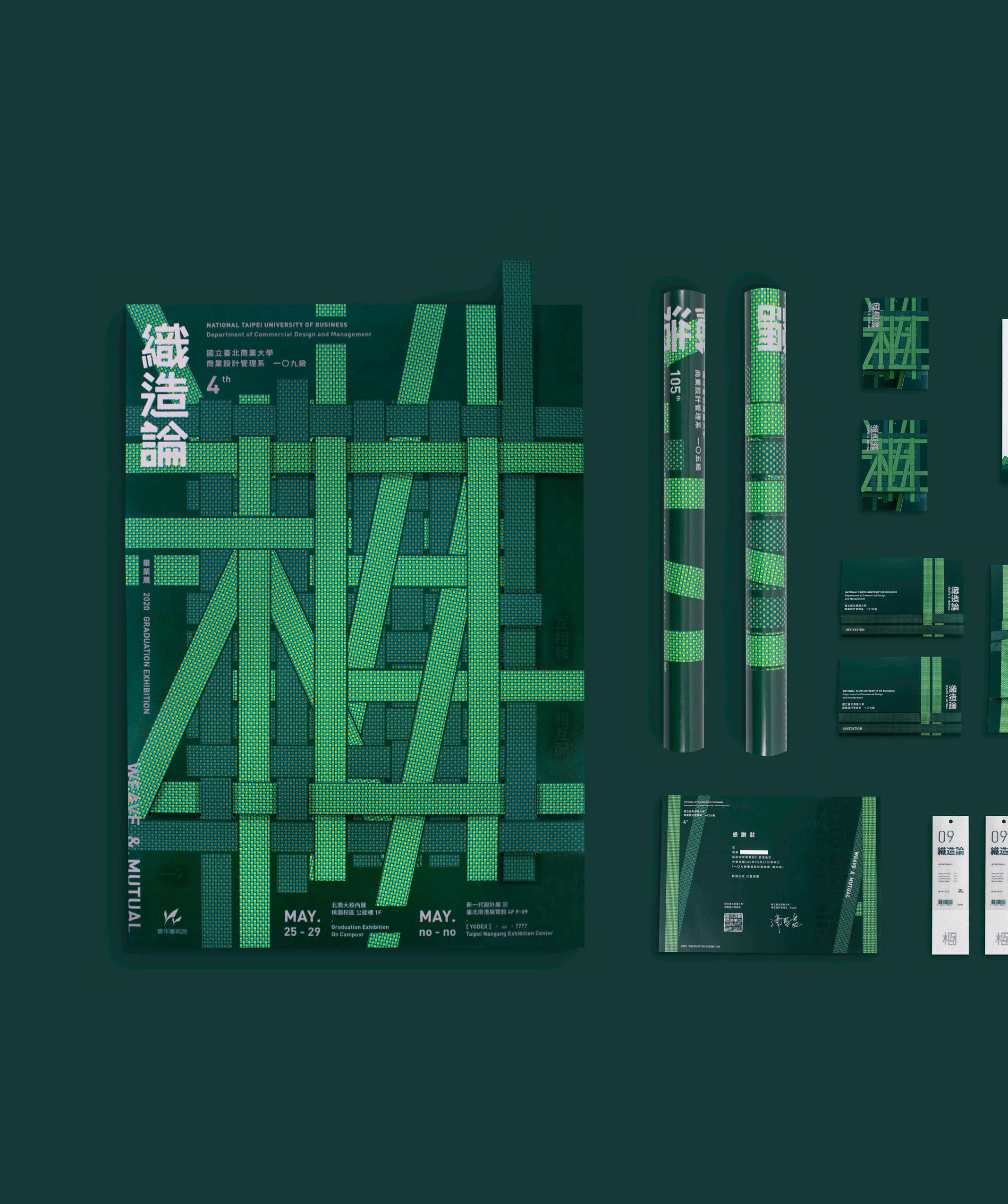 9 2020 ▪ 織造論 WEAVE & MUTUAL ▪ 組員:曾弘毅、黃毓晴、 許靜純、王若凡 ▪設計理念 本次畢展的主題為 - 織造論「ㄏㄜˊ」,「ㄏㄜ ˊ」是以互相合作,相互配合為概念創造之字, 當你我朝向同一目的,互相、相互是人與人合 作中最核心的精神,因為我們相互牽動著,我 們更能以互相的力道衝擊挑戰。 視覺上以編織表現手法,線段互相交錯、前後 排列,緊密的結合著彼此,以四種顏色並置混 合呈現不同樣貌的的色彩,展現合作時聚合不 同專長的人,我們相互羈絆、牢固的交疊,圍 繞著對方,完成共同目標。 WEA VE & MUTUAL Graphic Design