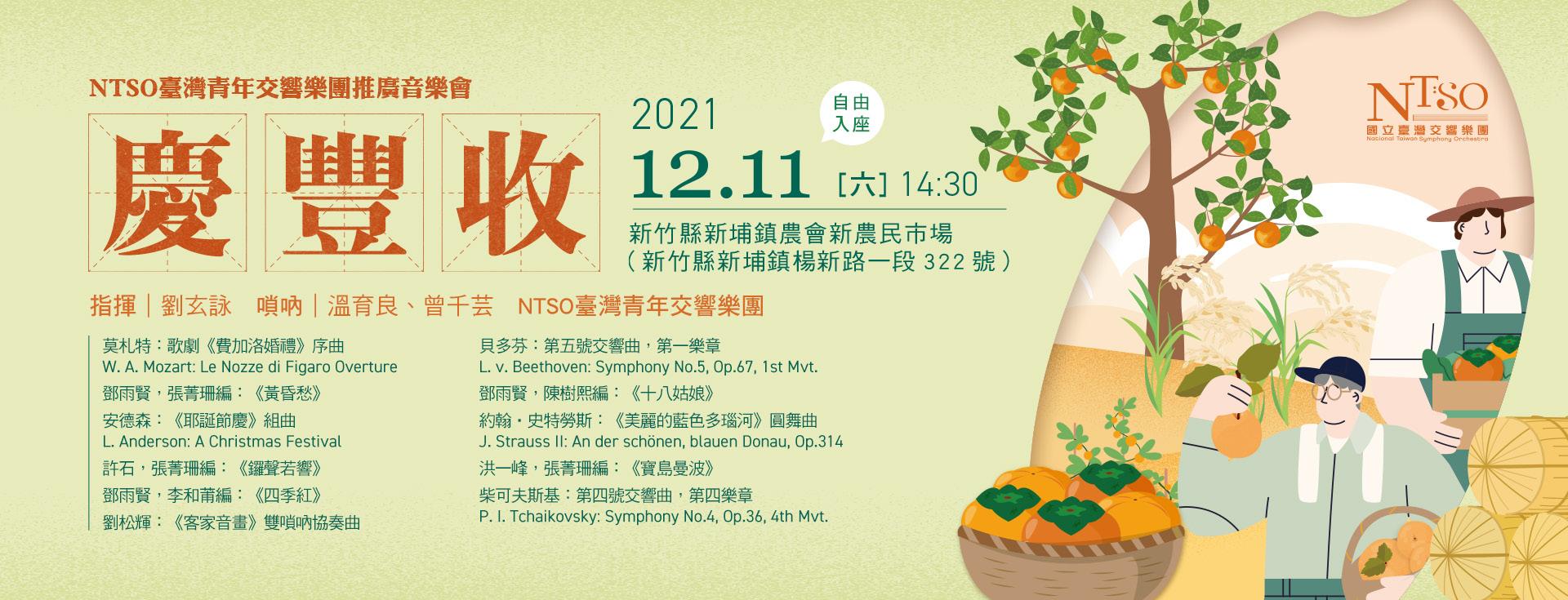 鄧雨賢,陳樹熙編:《十八姑娘》 小約翰.史特勞斯:《美麗的藍色多瑙河》圓舞曲 J. Strauss II: An der schönen, blauen Donau, Op.314 洪一峰,張菁珊編:《寶島曼波》 柴可夫斯基:第四號交響曲,第四樂章 P. I. Tchaikovsky: Symphony No.4, Op.36, 4th Mvt. 主辦單位保留演出異動權利 指揮/劉玄詠 嗩吶/曾千芸 NTSO 臺灣青年交響樂團 嗩吶/溫育良 1.NTSO 慶豐收 / 海報 2.NTSO 慶豐收 / Banner 3.NTSO 慶豐收 / 宣傳單 1 2 3 3 Graphic Design