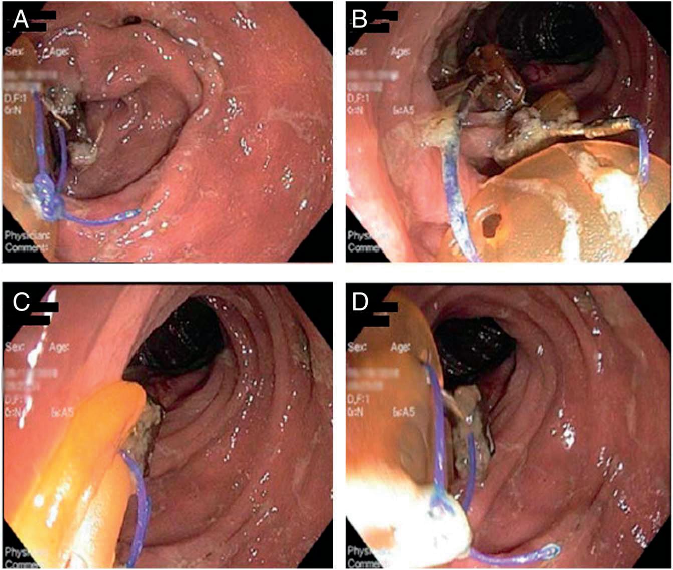 Figure1. (A–D)Endoscopicimagesfromcolonoscopyshowing2wiresfromgastricstimulatorseenpiercingthedistaltransversecolonabout 60cmfromtheanus,withadisk-likestructureattachedtothedistalpartofthewire.