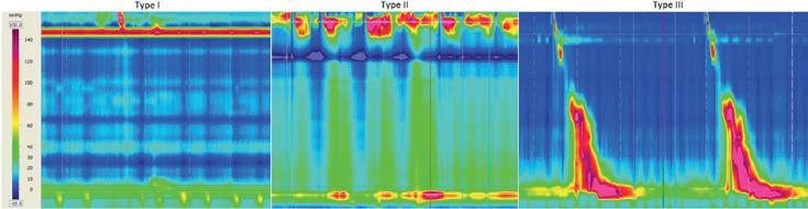 Figure2. Highresolutionmanometryofachalasiaphenotypes:typeI-absentpressurization(left),typeII-panpressurization(middle),andtypeIII-spastic contractions(right).Loweresophagealsphincterrelaxationisimpairedforallsubtypes.