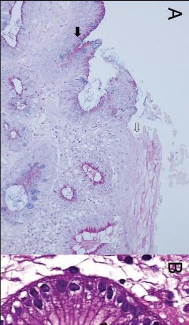 A63-year-oldmanwasseeninagastroenterologyclinicforevaluationofchroniccoughandglobussensation.Anesophagogastroduodenoscopydisplayedyellow,plaque-likematerialextendingfromtheproximaltodistalesophagus(Figure1).Theselesions couldnotberemovedwithlavageandweresubsequentlybiopsied.Thebiopsydemonstratedacollectionofroundcohesivecellswith clearedoutcytoplasmandsmallcentrallylocatednucleiarrangedinanacinarconfiguration,consistentwithectopicsebaceous glands.Theseglandsarelocatedwithinthelaminapropriaunderlyinganormal-appearingstratifiedsquamouscellepithelium (Figure2).ThepatientalsohadesophagealpHtestingshowinganormalDeMeesterscore.Thepatientwastreatedwithnasal fluticasonewithimprovementinhispresentingsymptoms.Therefore,thesymptomswereattributedtopostnasaldrip,ratherthan theectopicsebaceousglands.