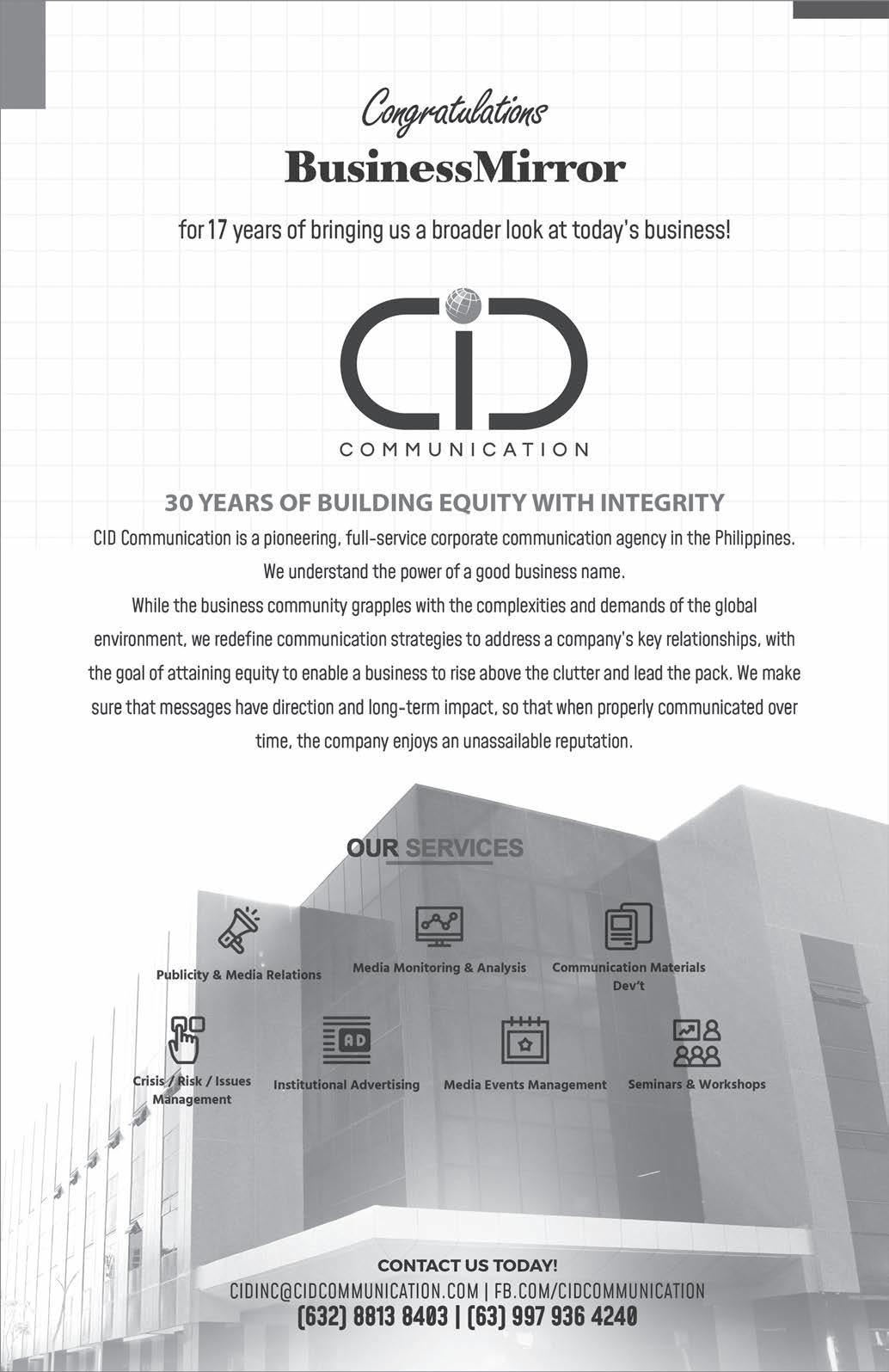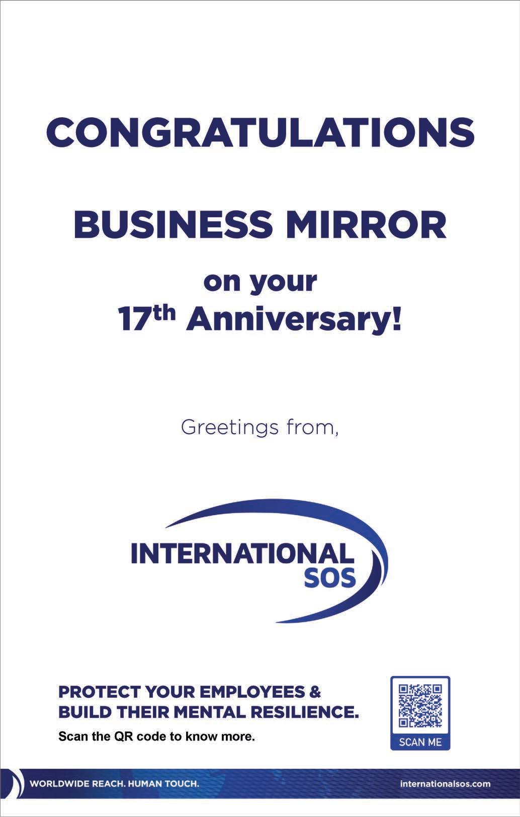 I T was sheer serendipity that on the day BUSINESSMIRROR released its anniversary folio marking its 17th anniversary, a 108-year old maritime icon from Norway would sail into Manila’s port (photo at left) as part of a global navigation. The men and women behind BUSINESSMIRROR had decided, early on, to use a sailboat— ttingly oating in an ocean of face masks—to illustrate the rough waters in which it had navigated through the pandemic. “Navigating@17: Continuing the Journey in a Pandemic World” is the theme for this year’s anniversary. It is to illustrate the paper’s sense of purpose, true grit, faith and hope in a world vastly disrupted, but where troubled waters still allow ships to keep sailing from shore to shore—because it’s the one thing worth doing for journalists whose main task is connecting people by letting them know what’s going on in each other’s corners of the planet. And so, this anniversary month, 17 years since Antonio L. Cabangon Chua launched his own dream of a paper (boat) promising “A Broader Look at Today’s Business,” we mark the occasion with a prayer of thanks. And a hope that, like the Norwegian Statsraad Lehmkuhl, BUSINESSMIRROR will keep sailing for a hundred years more. PESO EXCHANGE RATES US 58.9550 ■ JAPAN 0.4044 ■ UK 64.7149 ■ HK 7.5104 ■ SINGAPORE 40.9951 ■ AUSTRALIA 36.9648 ■ SAUDI ARABIA 15.6921 ■ EU 57.2158 ■ KOREA 0.0412 ■ CHINA 8.2248 Source: BSP (October 12, 2022) C A BusinessMirror A broader look at today’s business www.businessmirror.com.ph P. | | 7 DAYS A WEEK■ Thursday, October 13, 2022 Vol. 18 No. 1 ROTARY CLUB OF MANILA JOURNALISM AWARDS 2006 National Newspaper of the Year 2011 National Newspaper of the Year 2013 Business Newspaper of the Year 2017 Business Newspaper of the Year 2019 Business Newspaper of the Year 2021 Pro Patria Award PHILIPPINE STATISTICS AUTHORITY 2018 Data Champion EJAP JOURNALISM AWARDS BUSINESS NEWS SOURCE OF THE YEAR (2017, 2018, 2019, 2020) DEPARTMENT OF SCIENCE AND TECHNOLOGY 2018 BANTOG MEDIA AWARDS EXPORT EARNINGS SEEN TO HIT $100B