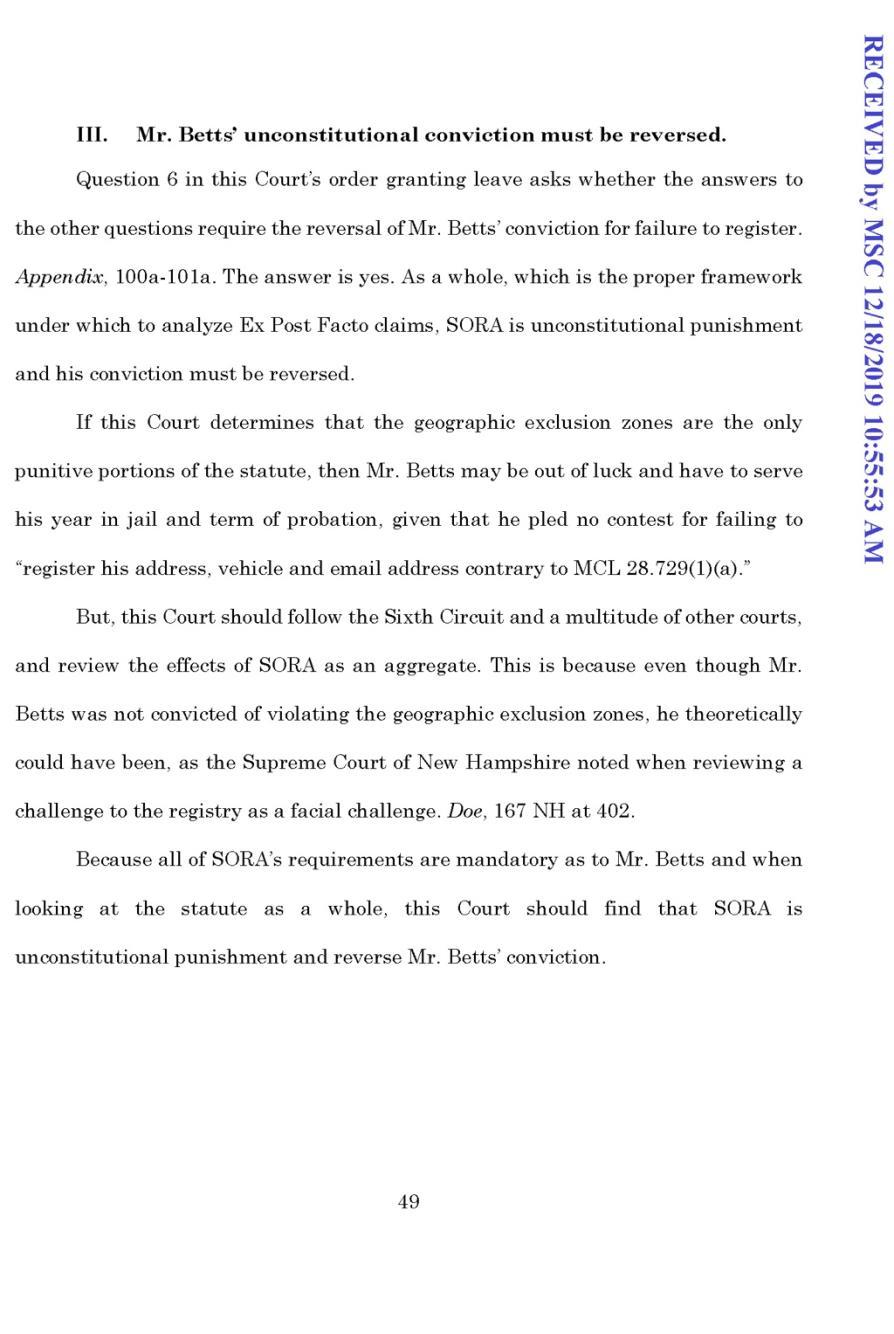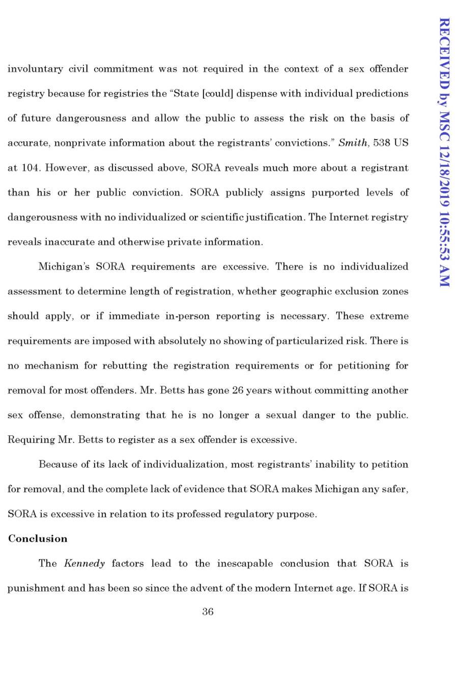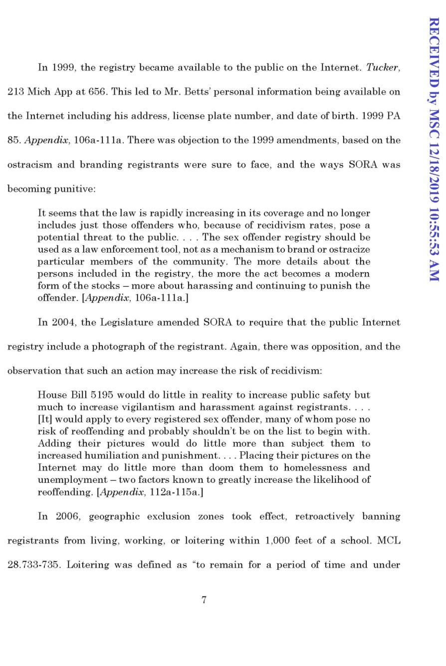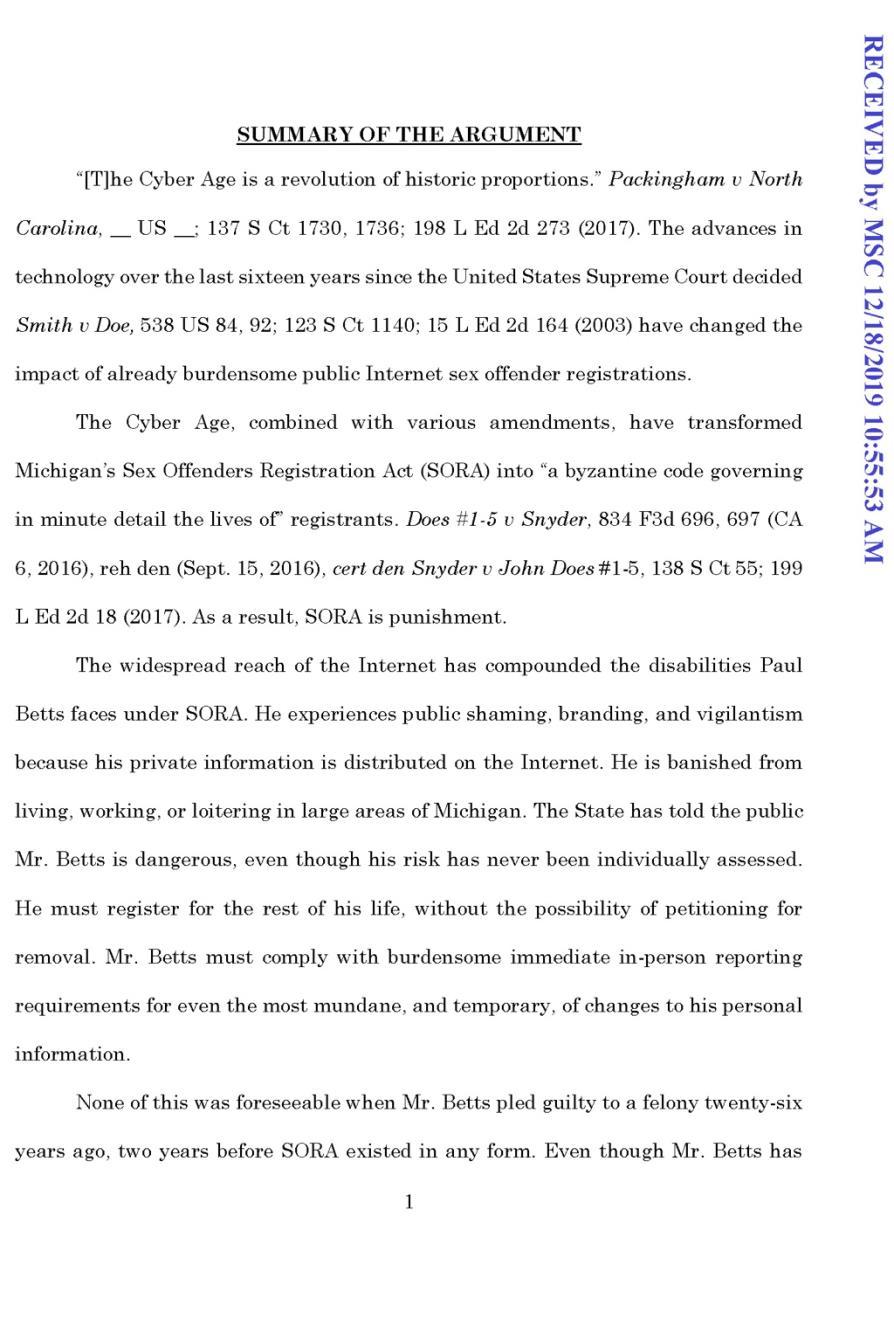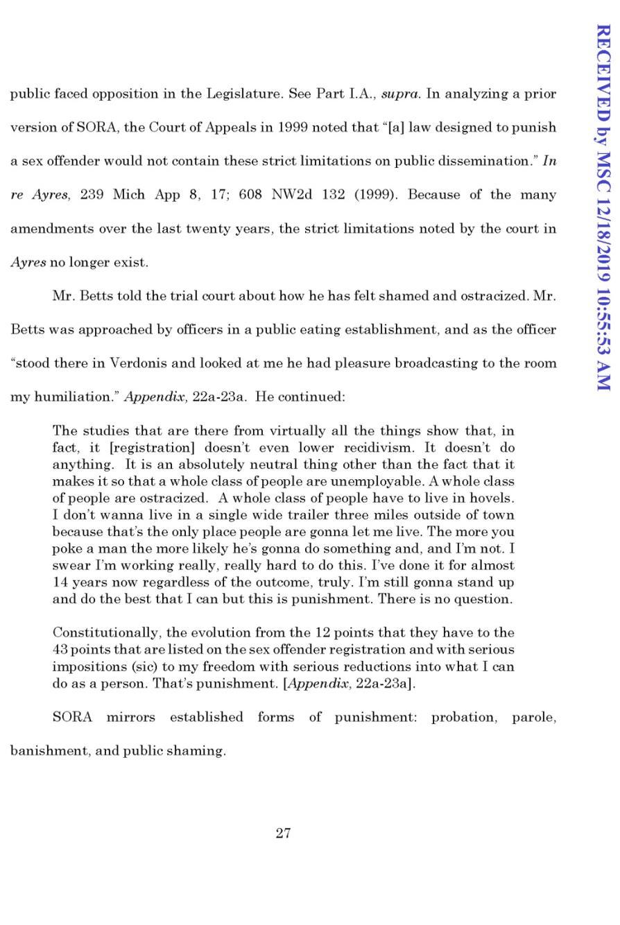 The issue in People v Betts was whether the 2011 Sex Offenders Registration Act was unconstitutional, ex post facto punishment. In July 2021, the Michigan Supreme Court held that it was. The decision capped off nine years of litigation, which first began with Mr. Betts’s pro per motion in the trial court. The Court specifically noted the following portions of the 2011 SORA that supported its conclusion that registration was punishment, and unconstitutional when imposed retroactively: it restricts where registrants can live, work, and loiter; it is comparable to shaming, given the public internet registry and the vast amount of information made public just by registration; it resembles parole, given the “significant amount of supervision by the state”; it imposes onerous burdens such as immediate in person reporting requirements based on numerous and often mundane life events; it is excessive given the “uncertainty of the 2011 SORA’s efficacy” in reducing recidivism, due to the lack of an individualized assessment of risk. All of SORA’s punitive burdens were discussed extensively in this brief.
