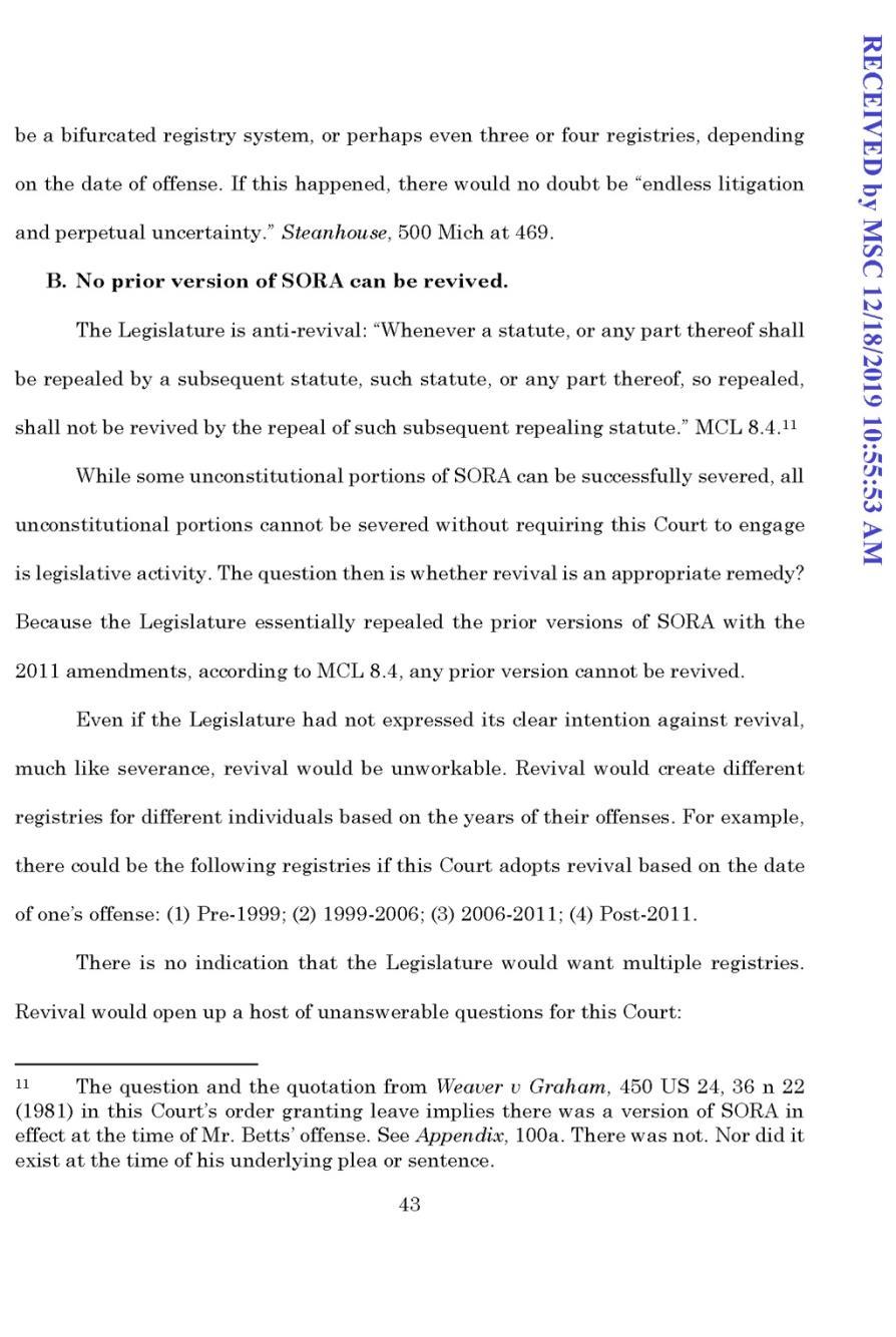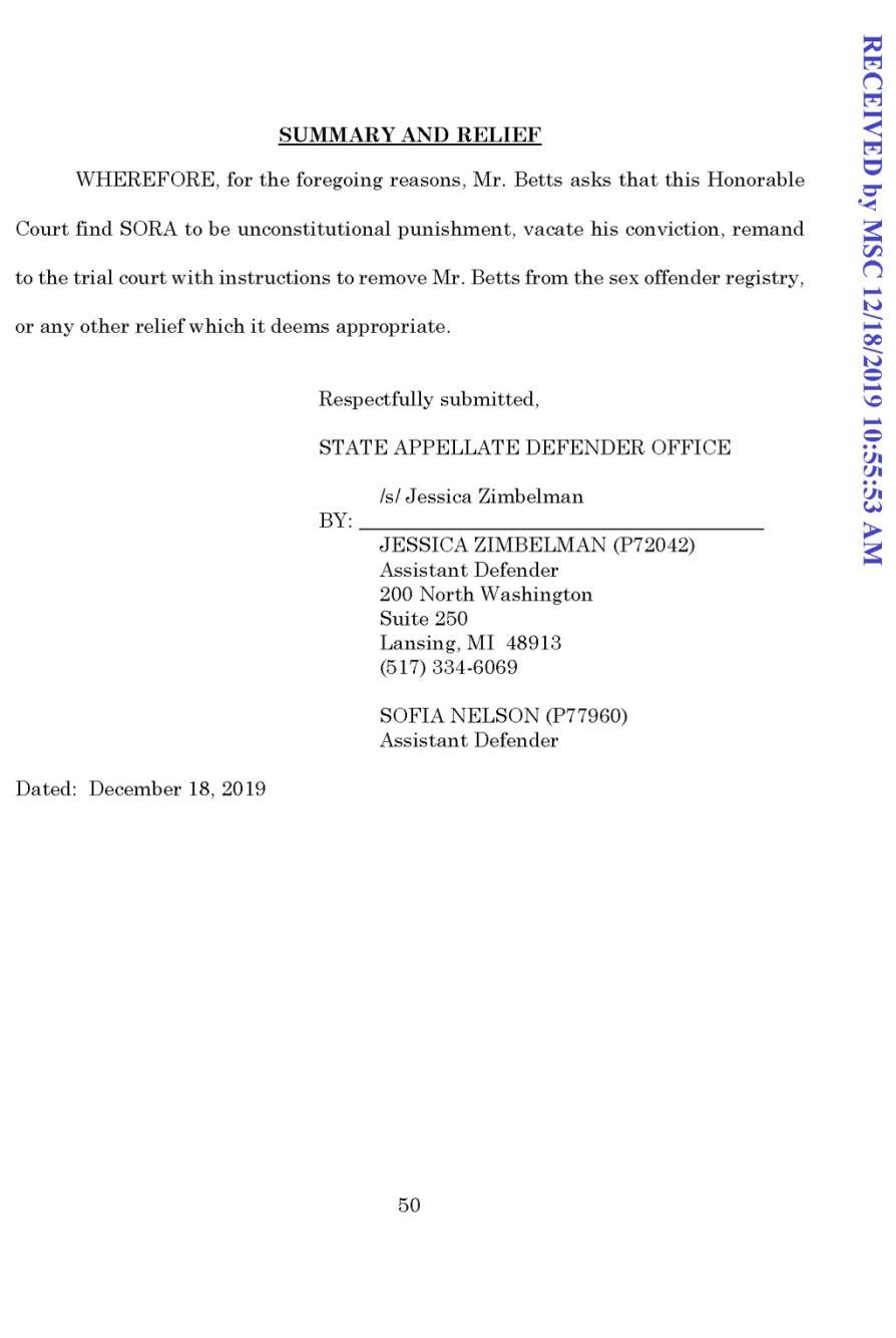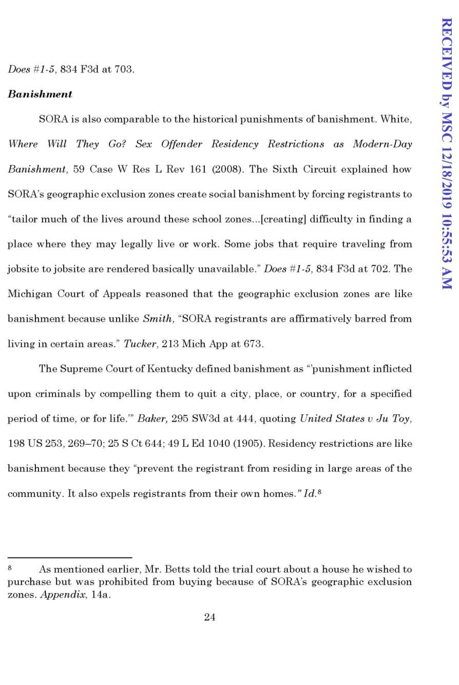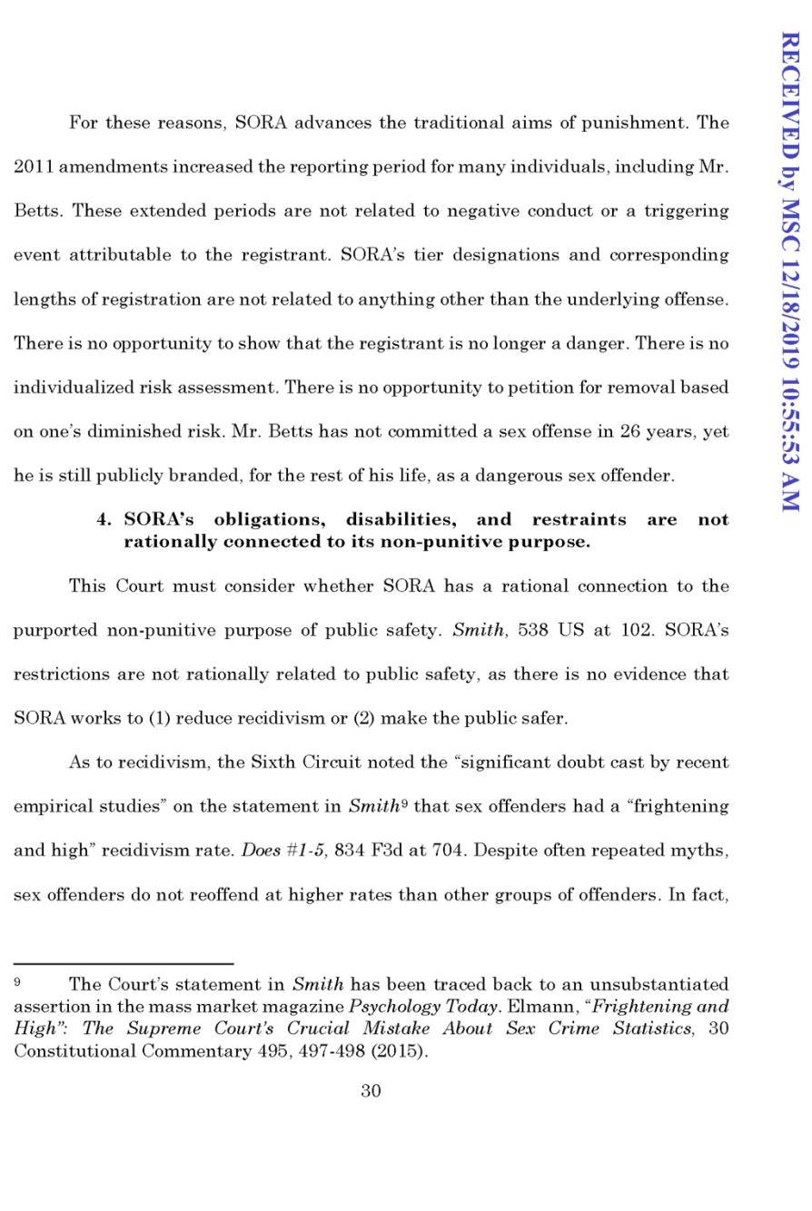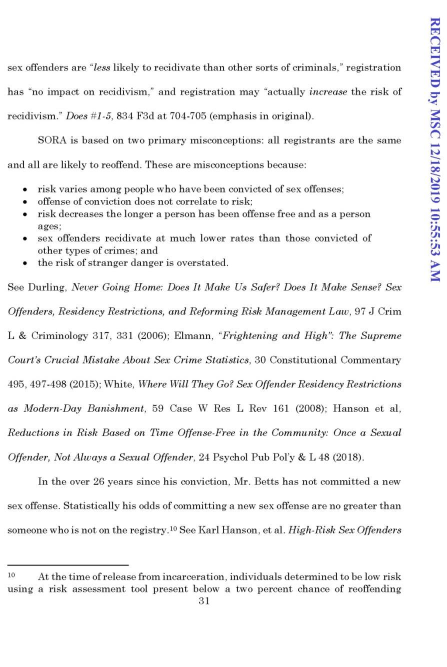 The issue in People v Betts was whether the 2011 Sex Offenders Registration Act was unconstitutional, ex post facto punishment. In July 2021, the Michigan Supreme Court held that it was. The decision capped off nine years of litigation, which first began with Mr. Betts’s pro per motion in the trial court. The Court specifically noted the following portions of the 2011 SORA that supported its conclusion that registration was punishment, and unconstitutional when imposed retroactively: it restricts where registrants can live, work, and loiter; it is comparable to shaming, given the public internet registry and the vast amount of information made public just by registration; it resembles parole, given the “significant amount of supervision by the state”; it imposes onerous burdens such as immediate in person reporting requirements based on numerous and often mundane life events; it is excessive given the “uncertainty of the 2011 SORA’s efficacy” in reducing recidivism, due to the lack of an individualized assessment of risk. All of SORA’s punitive burdens were discussed extensively in this brief.