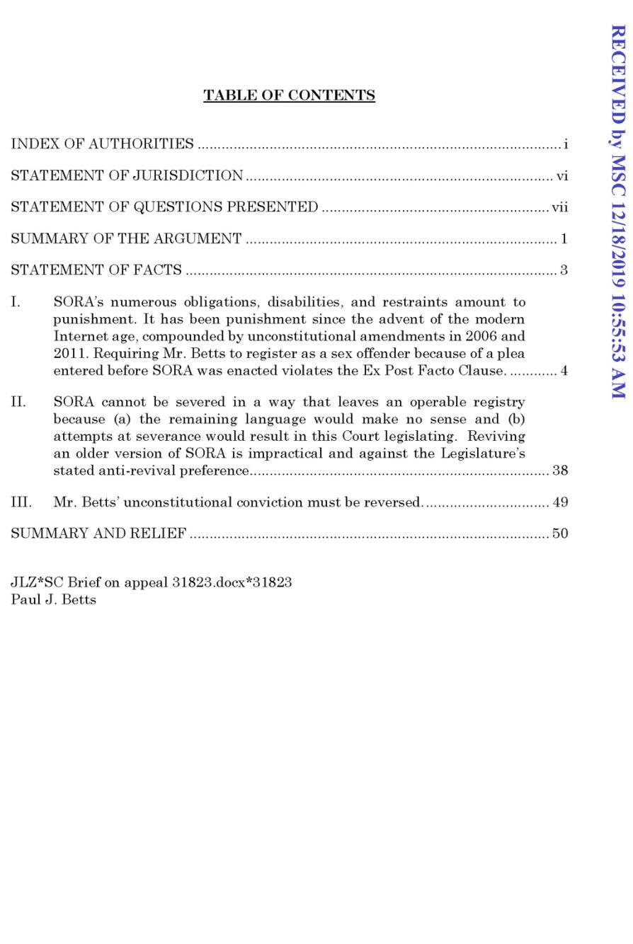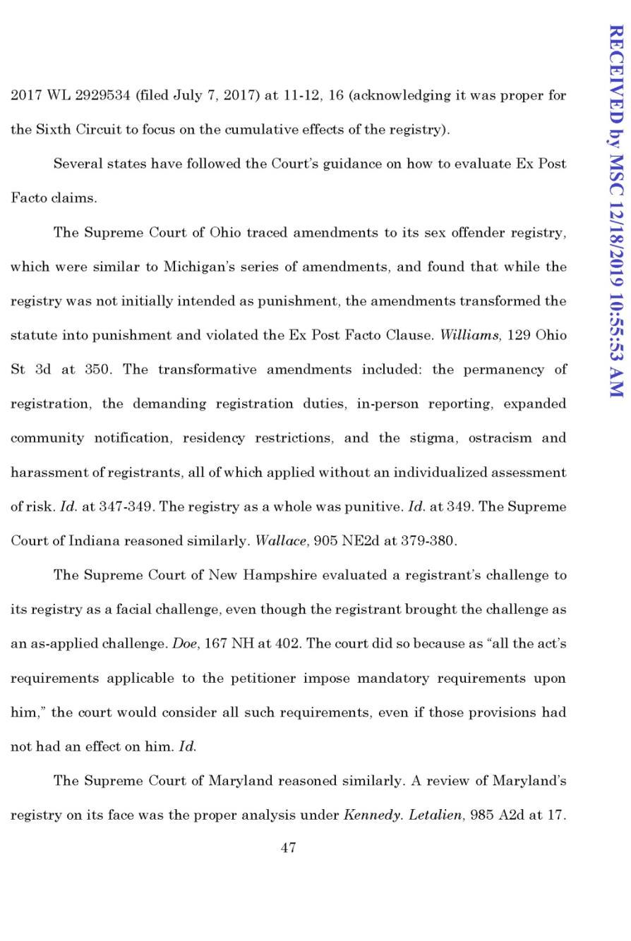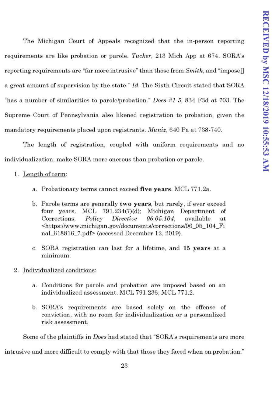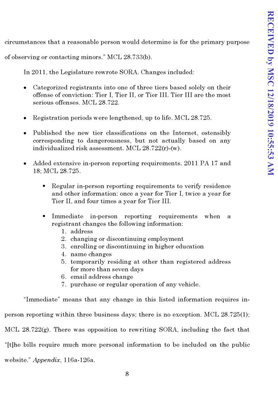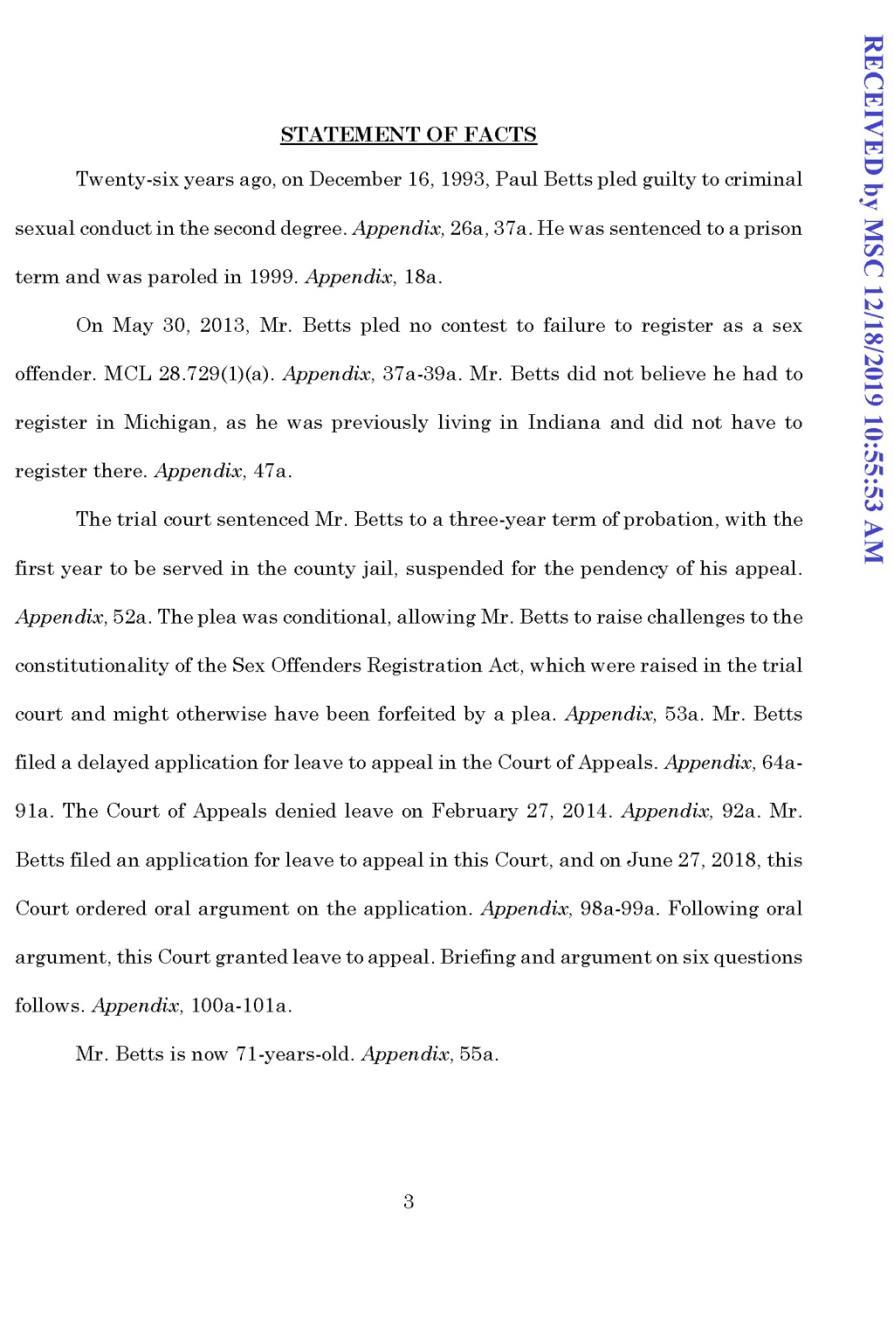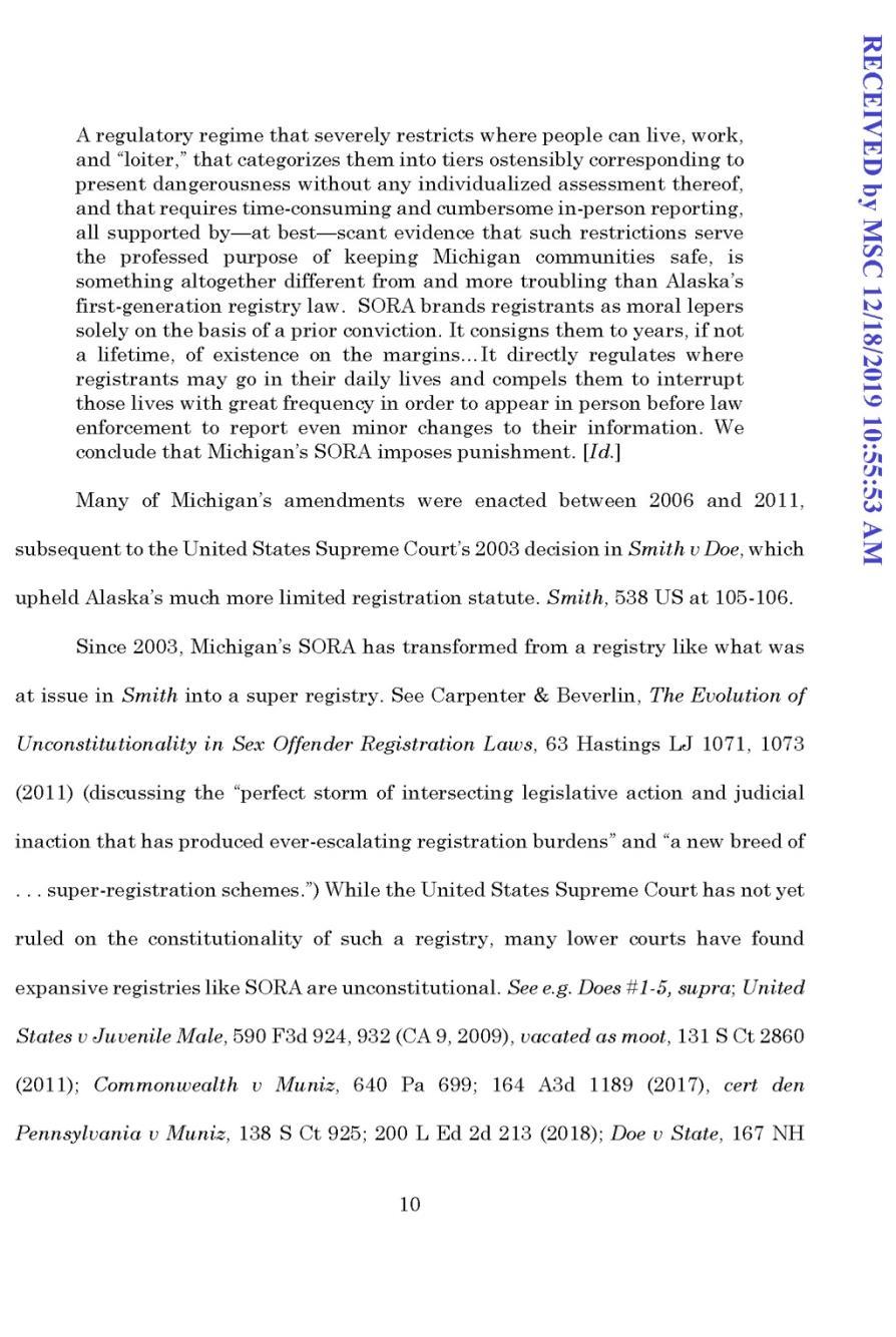 The issue in People v Betts was whether the 2011 Sex Offenders Registration Act was unconstitutional, ex post facto punishment. In July 2021, the Michigan Supreme Court held that it was. The decision capped off nine years of litigation, which first began with Mr. Betts’s pro per motion in the trial court. The Court specifically noted the following portions of the 2011 SORA that supported its conclusion that registration was punishment, and unconstitutional when imposed retroactively: it restricts where registrants can live, work, and loiter; it is comparable to shaming, given the public internet registry and the vast amount of information made public just by registration; it resembles parole, given the “significant amount of supervision by the state”; it imposes onerous burdens such as immediate in person reporting requirements based on numerous and often mundane life events; it is excessive given the “uncertainty of the 2011 SORA’s efficacy” in reducing recidivism, due to the lack of an individualized assessment of risk. All of SORA’s punitive burdens were discussed extensively in this brief.