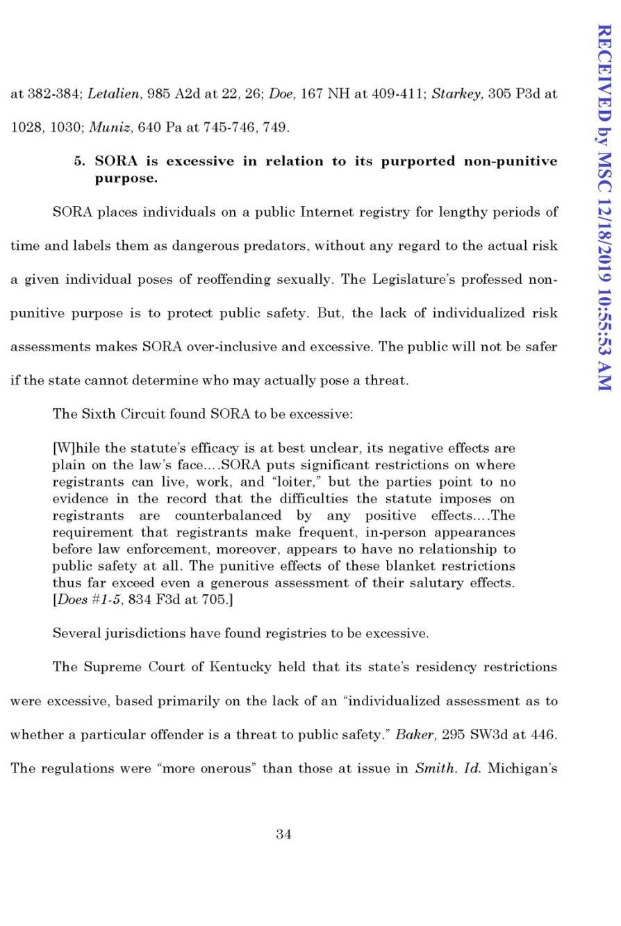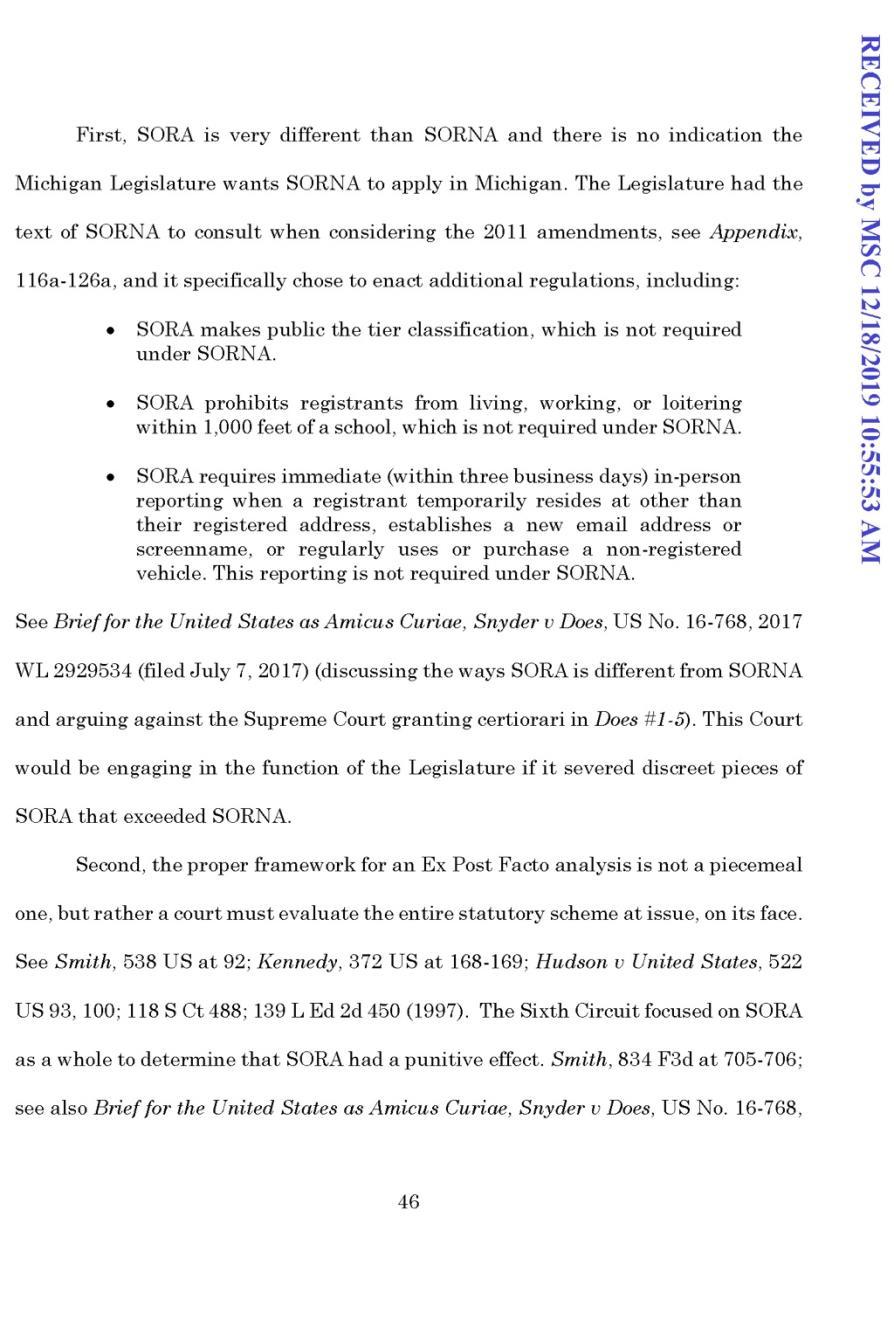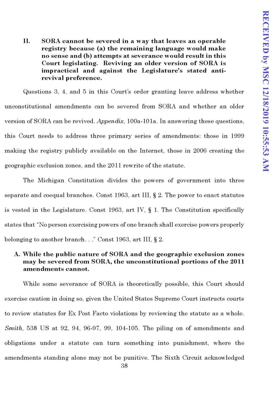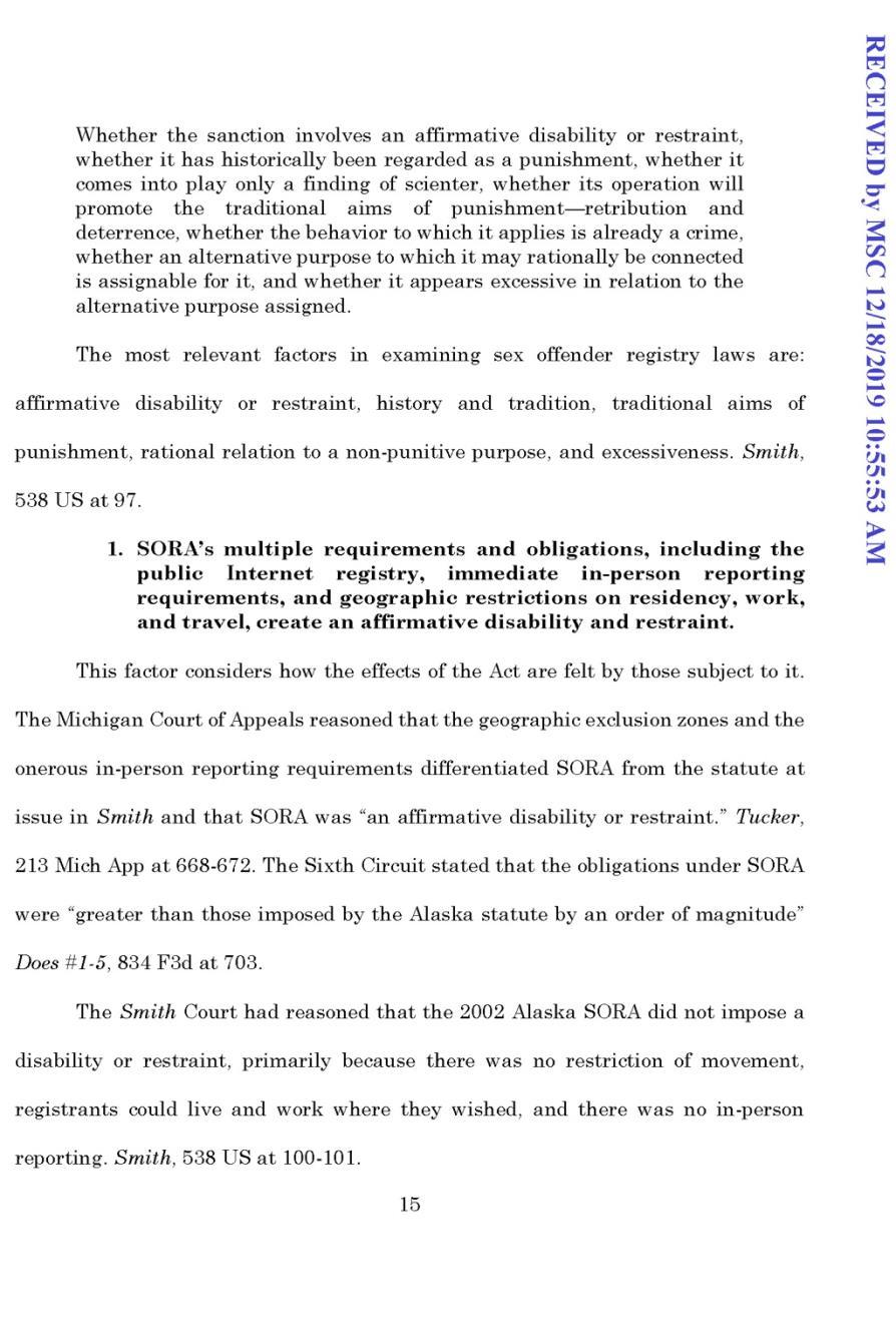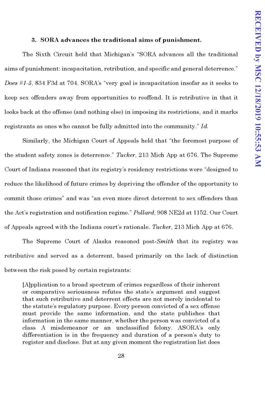 The issue in People v Betts was whether the 2011 Sex Offenders Registration Act was unconstitutional, ex post facto punishment. In July 2021, the Michigan Supreme Court held that it was. The decision capped off nine years of litigation, which first began with Mr. Betts’s pro per motion in the trial court. The Court specifically noted the following portions of the 2011 SORA that supported its conclusion that registration was punishment, and unconstitutional when imposed retroactively: it restricts where registrants can live, work, and loiter; it is comparable to shaming, given the public internet registry and the vast amount of information made public just by registration; it resembles parole, given the “significant amount of supervision by the state”; it imposes onerous burdens such as immediate in person reporting requirements based on numerous and often mundane life events; it is excessive given the “uncertainty of the 2011 SORA’s efficacy” in reducing recidivism, due to the lack of an individualized assessment of risk. All of SORA’s punitive burdens were discussed extensively in this brief.
